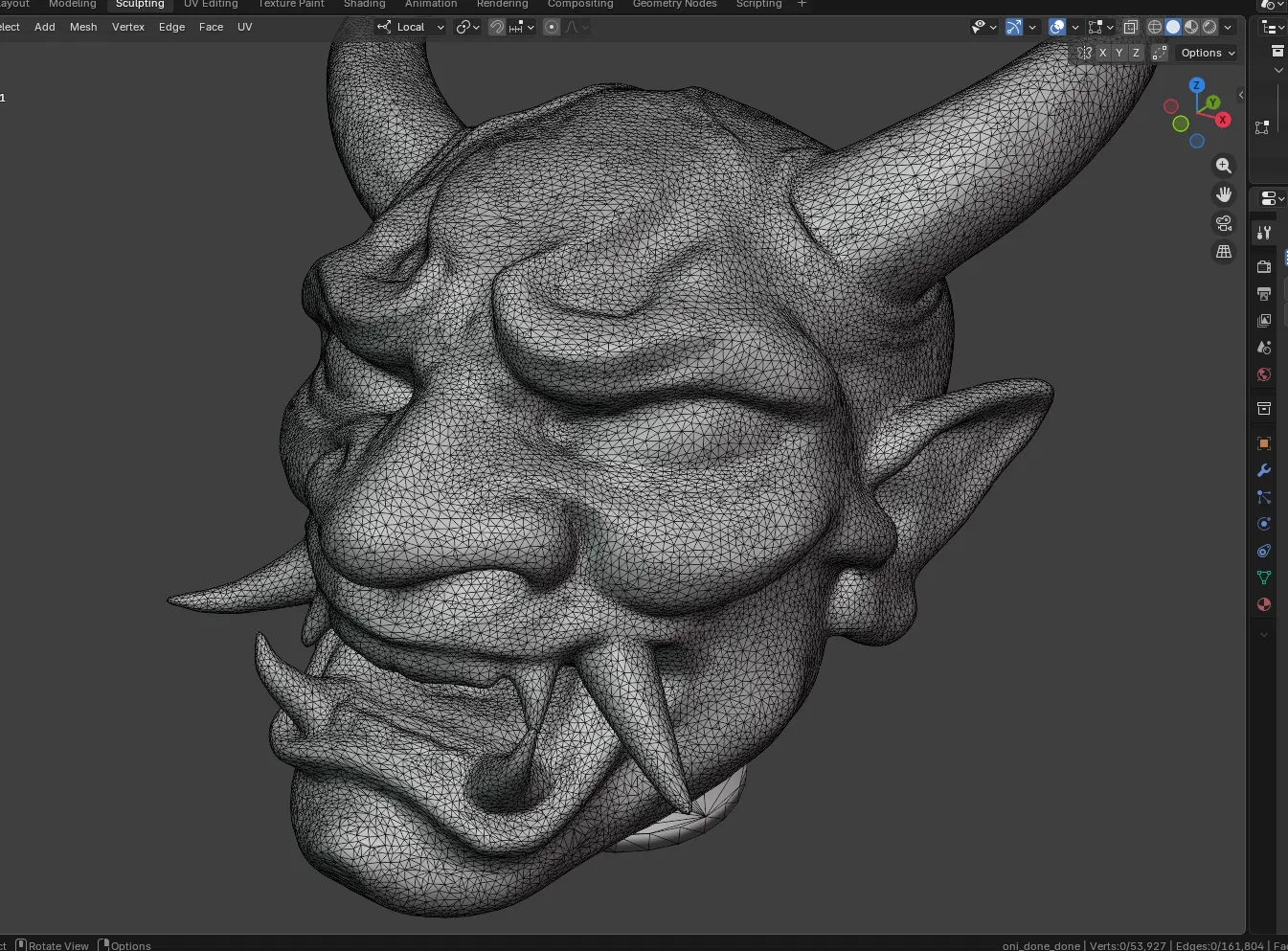 Đầu Oni được làm từ một tấm hình (nano banana), mình chuyển sang 3D bằng Hunyuan trên ComfyUi rồi cuối cùng chỉnh trong Blender để dọn mesh cho sạch (không thôi nó rối lắm). Mình cũng thêm cái chân đế nữa.