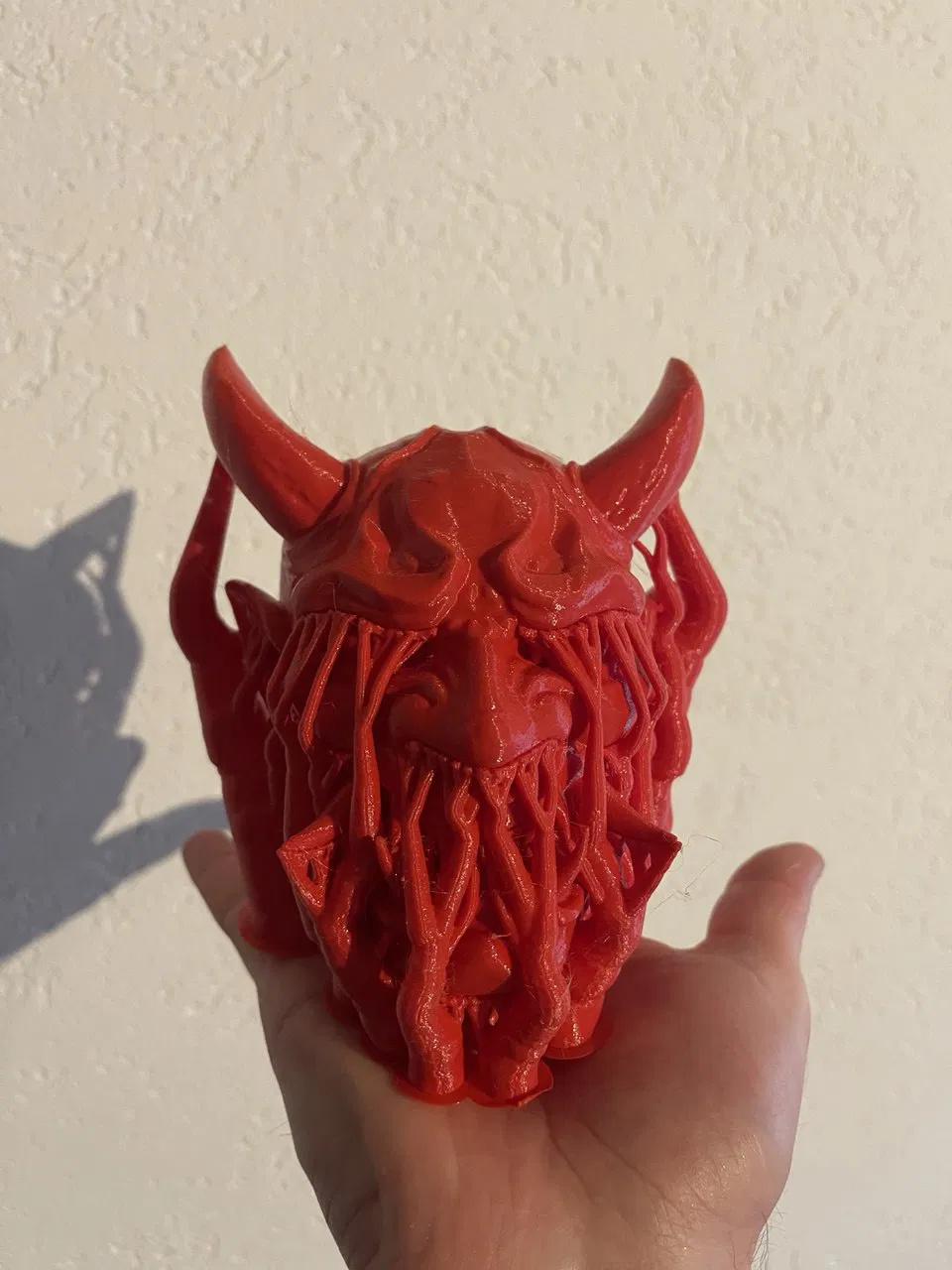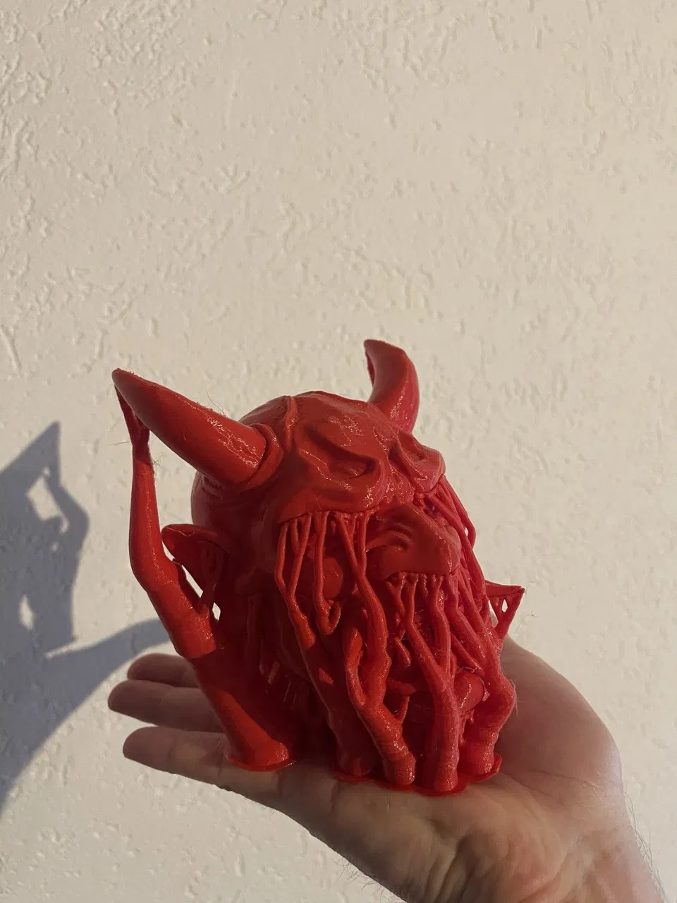 Mẫu đầu Oni kèm chân đế, dựng từ ảnh rồi chuyển 3D bằng Hunyuan trên ComfyUI và dọn mesh trong Blender. Cần organic supports; gợi ý nozzle 0.4, infill 5%, layer 0.2–0.15mm. Thời gian in 3–9h, 75–150g.