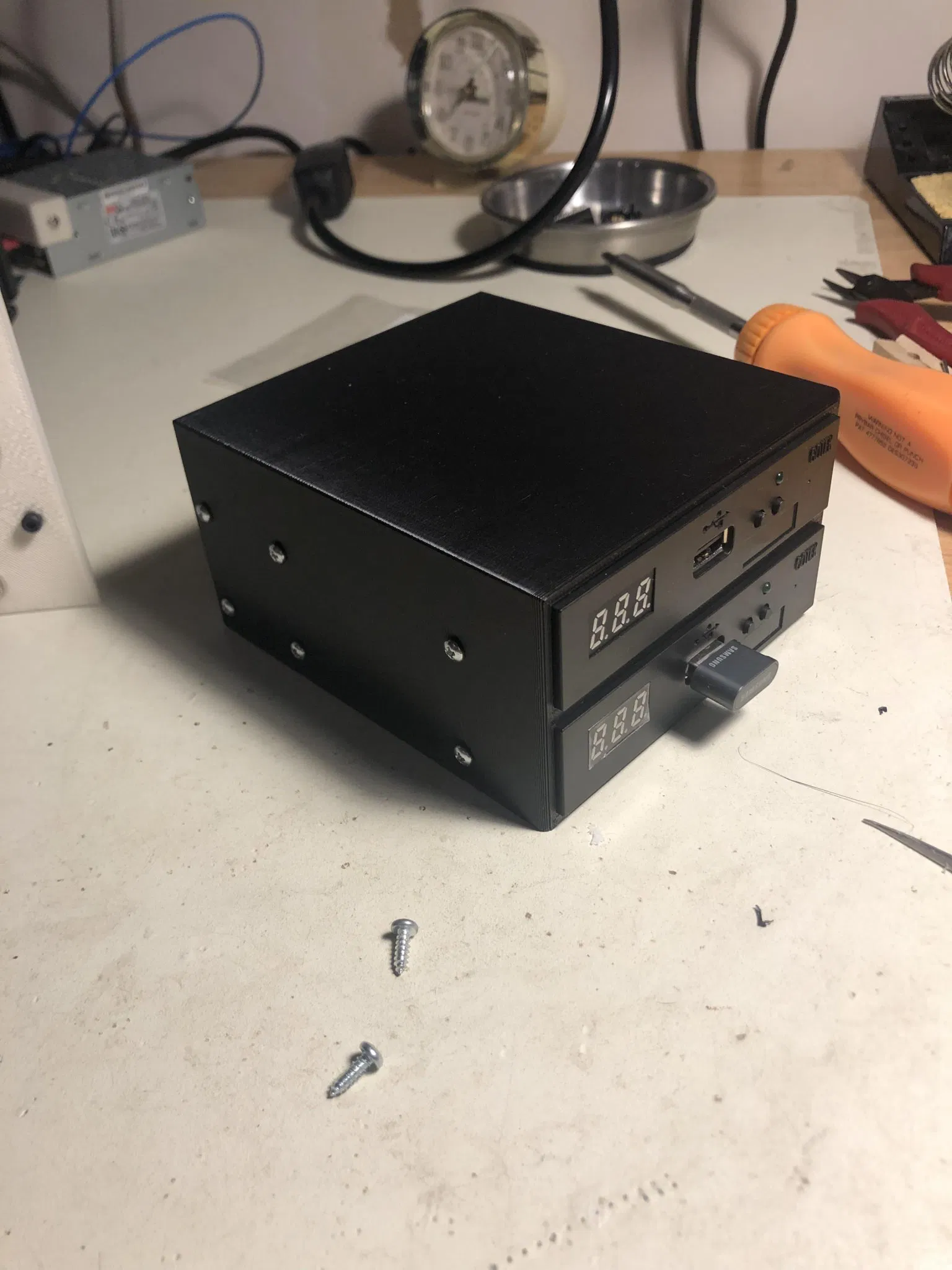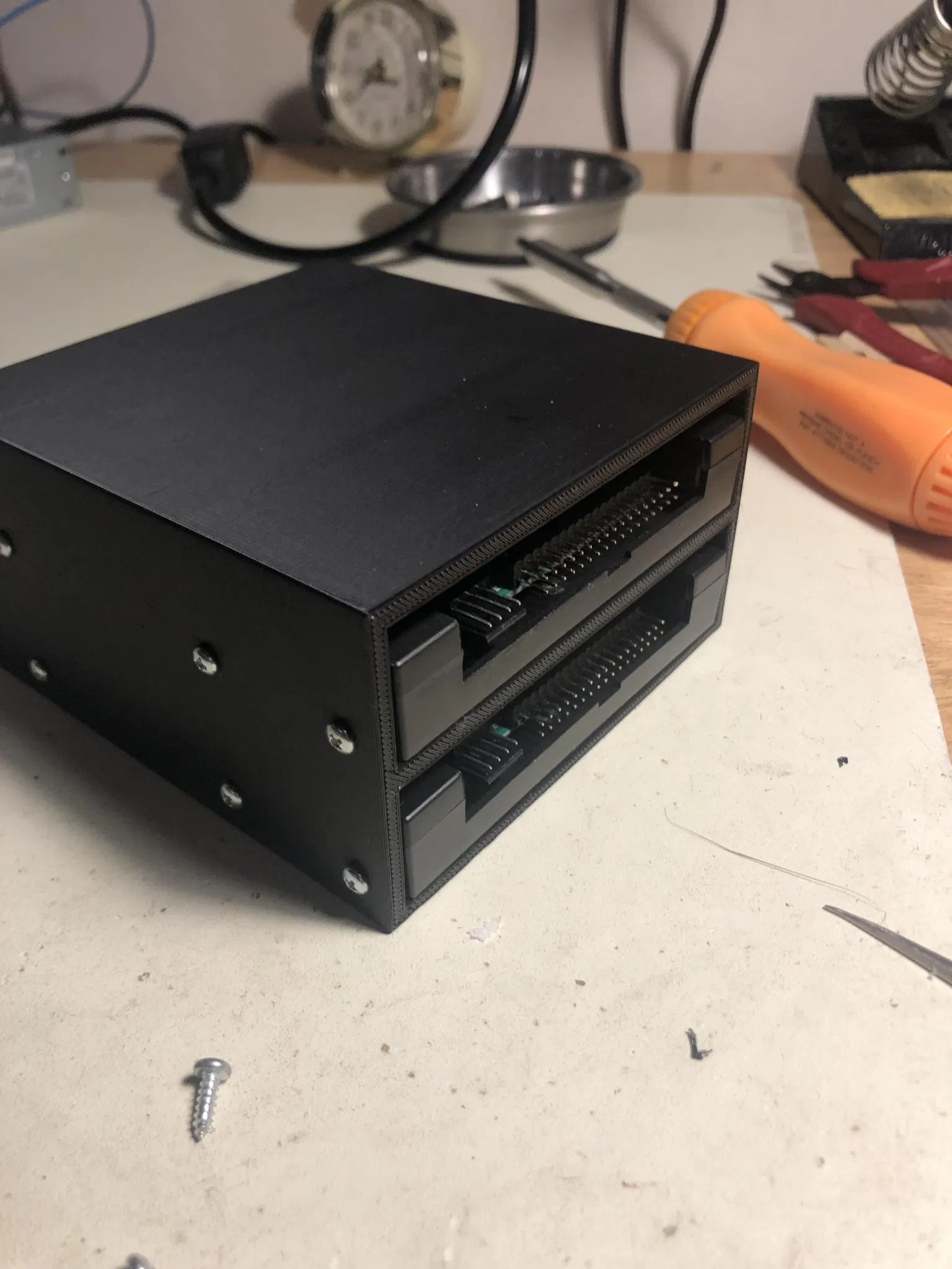 Cần một vỏ cho các ổ Gotek đôi của tôi. Các vít đi kèm với ổ không phải là tốt nhất để kết nối với chính ổ. Tôi đã sử dụng một số vít khác làm tốt hơn. Bạn có thể thấy một ví dụ về các vít trong hình ảnh phía trước.
