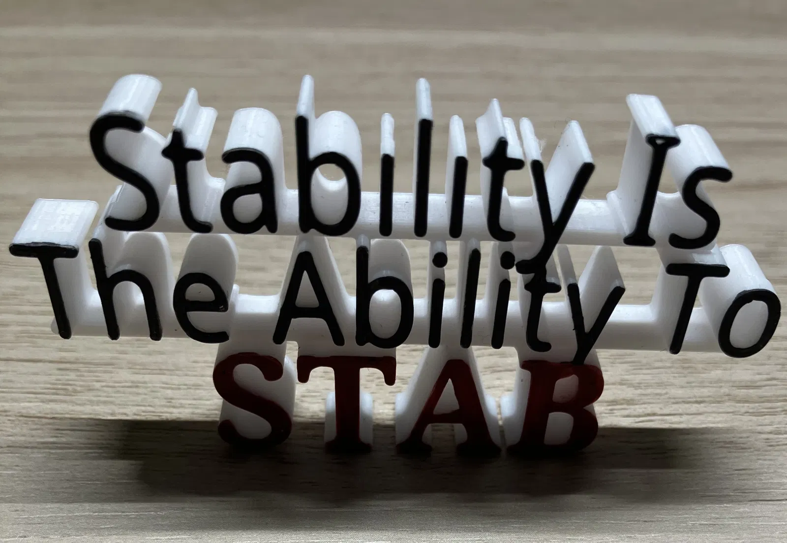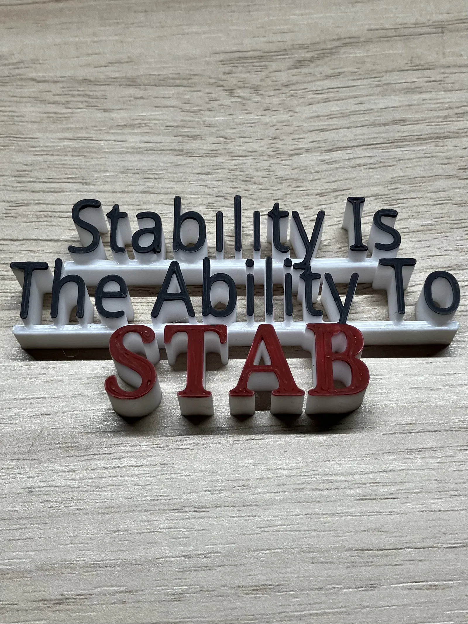 Mẫu 3D “stability sign” là một bảng hiệu dựng dọc với chữ liên quan đến “stability” (khả năng đâm/stab). Phù hợp để in 3D làm bảng chữ trang trí theo chủ đề sign, knife và text.