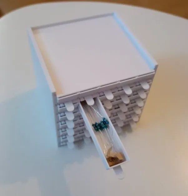 Bộ ngăn kéo mini gọn nhẹ để cất linh kiện nhỏ như điện trở, giúp sắp xếp ngăn nắp và dễ lấy. Khuyến nghị in ngăn kéo bằng vase mode (perimeters 1mm), các phần khác in thường với layer height <=0.15mm.