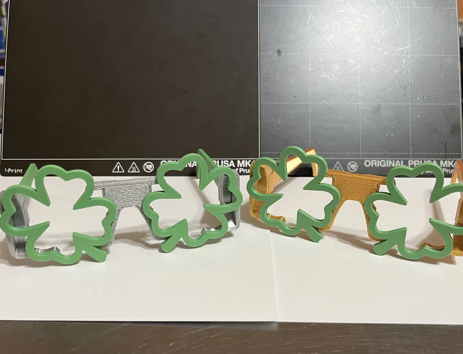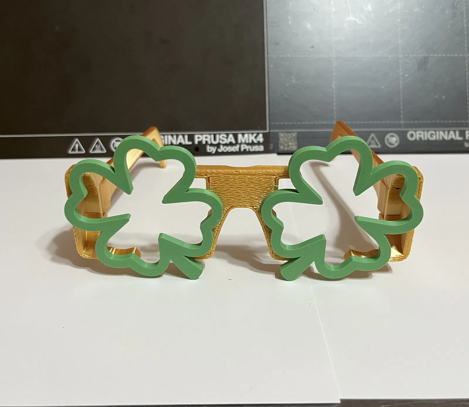 Kính Cỏ Ba Lá vui nhộn cho Saint Patrick’s Day, dùng print-in-place hinge nên khỏi cần đinh tán nung chảy. Càng kính ấn vào chốt trên gọng, có thể thêm 1 giọt keo để bám chắc. In 2 màu bằng manual filament swap, MMU không bắt buộc.