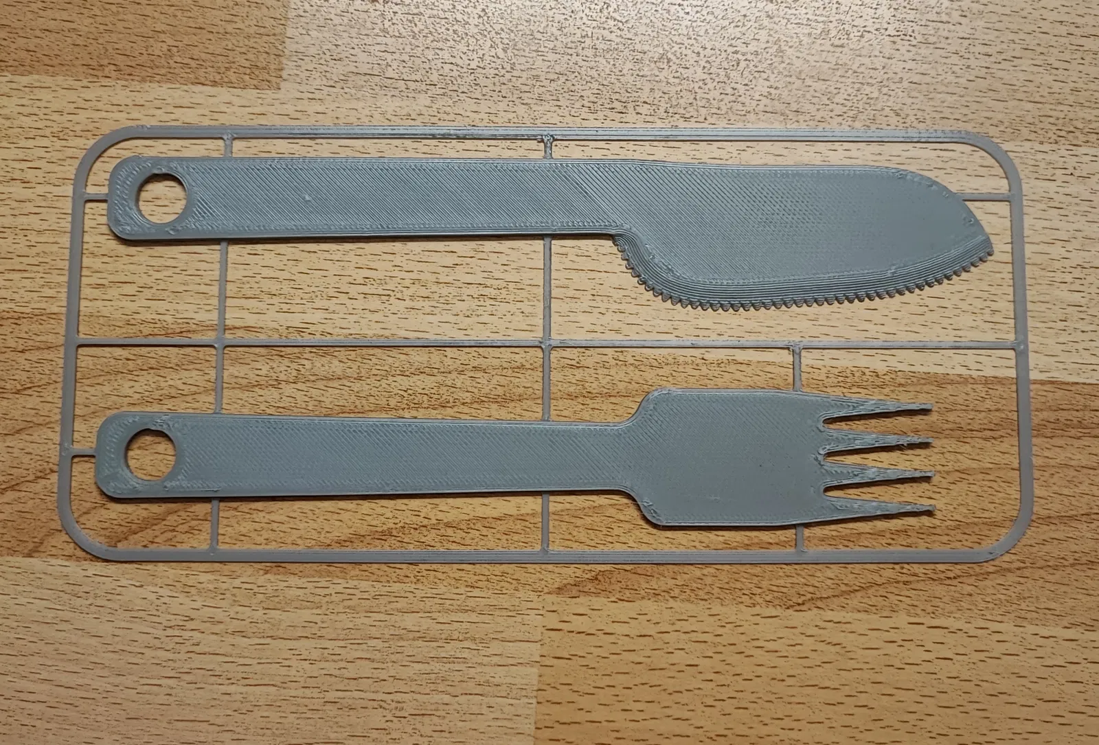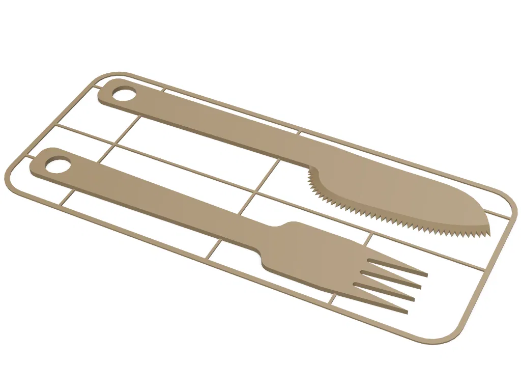 Một bộ dụng cụ ăn uống dã ngoại nhẹ, in 3D dạng một khối, gồm 1 dao và 1 nĩa được nối chung trong khung kiểu sprue.