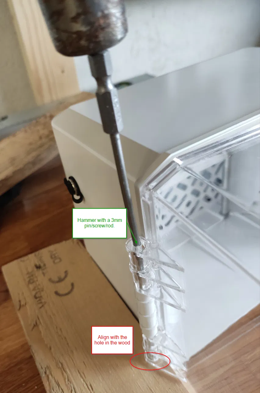 Bạn sẽ cần tháo hinge rod ra; mình dùng một con ốc M3x40 và búa để đóng nó ra.