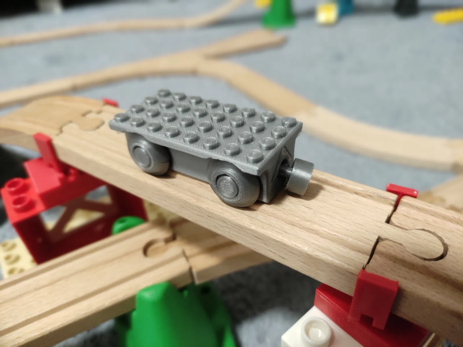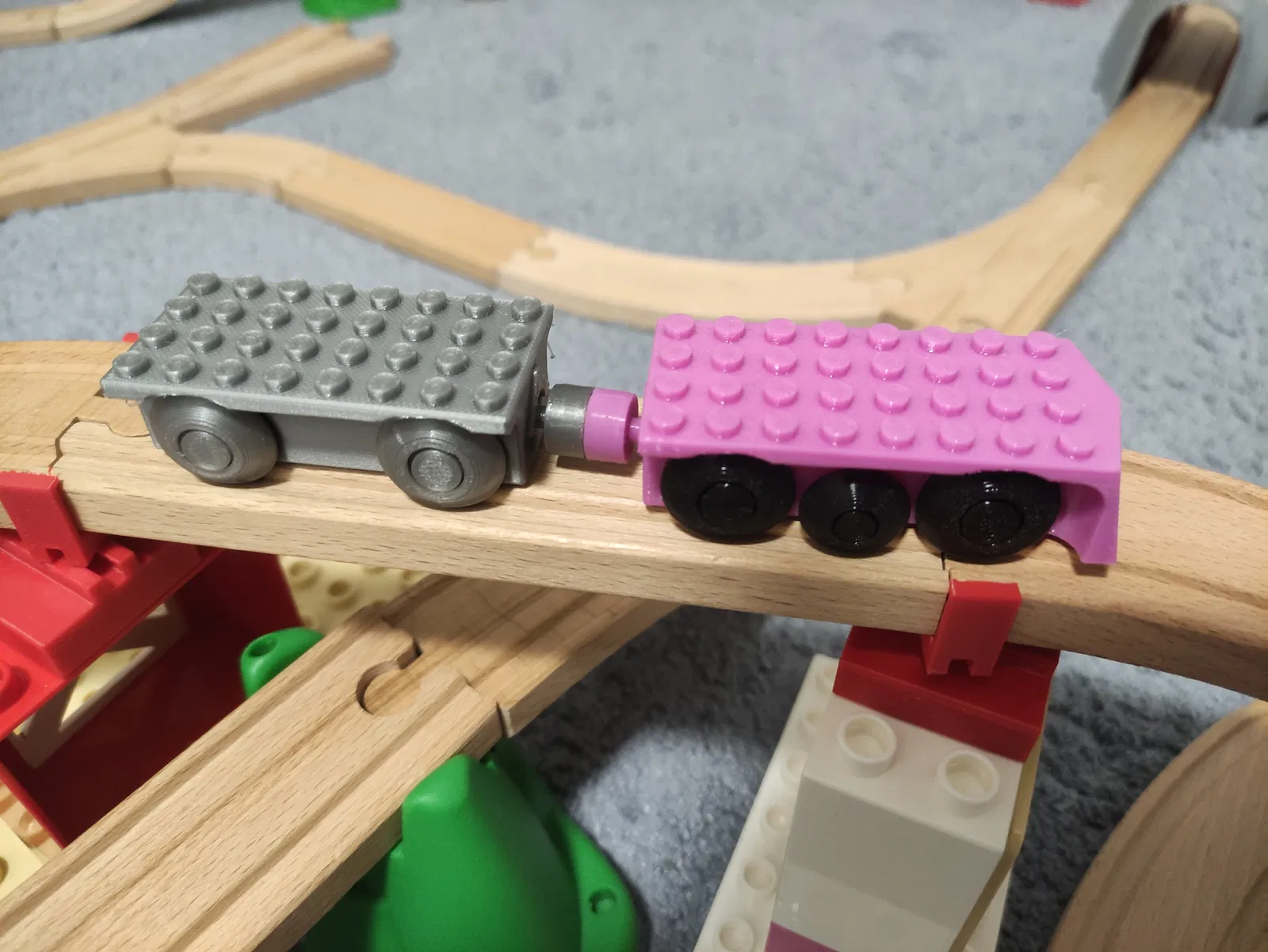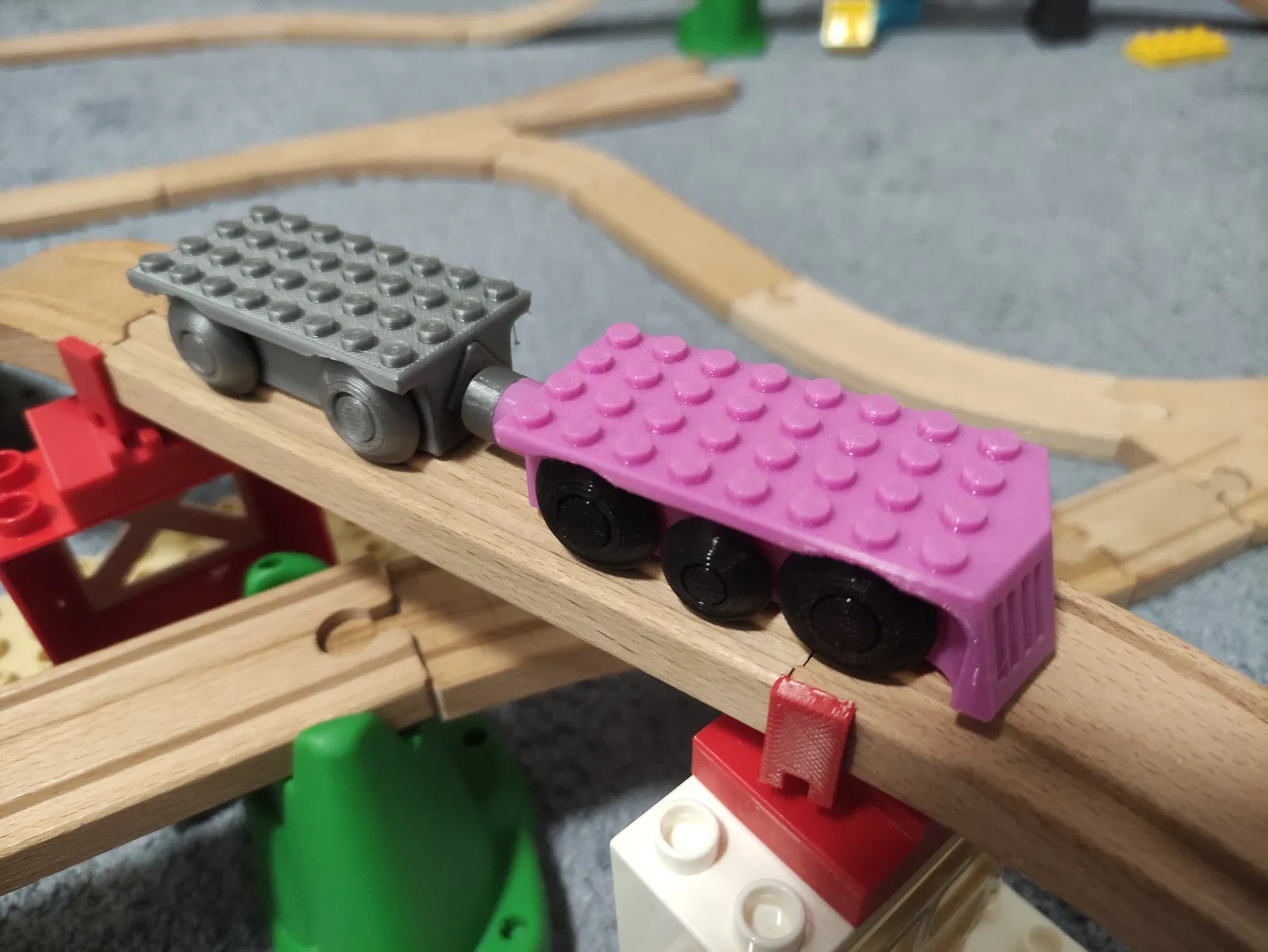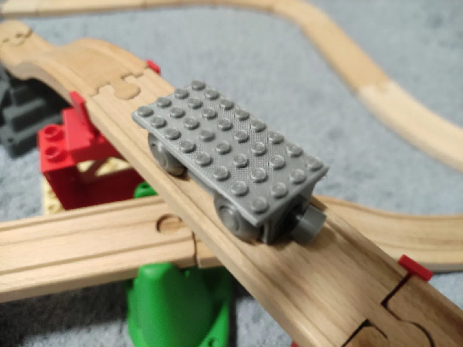 Adapter toa xe Brio thiết kế lại hoàn toàn, gọn hơn và dễ in hơn, hầu như không cần dán keo (trừ nam châm). Phần trên có chốt classic brick, vẫn tương thích DUPLO, giúp bạn xây đồ chơi trực tiếp trên toa.