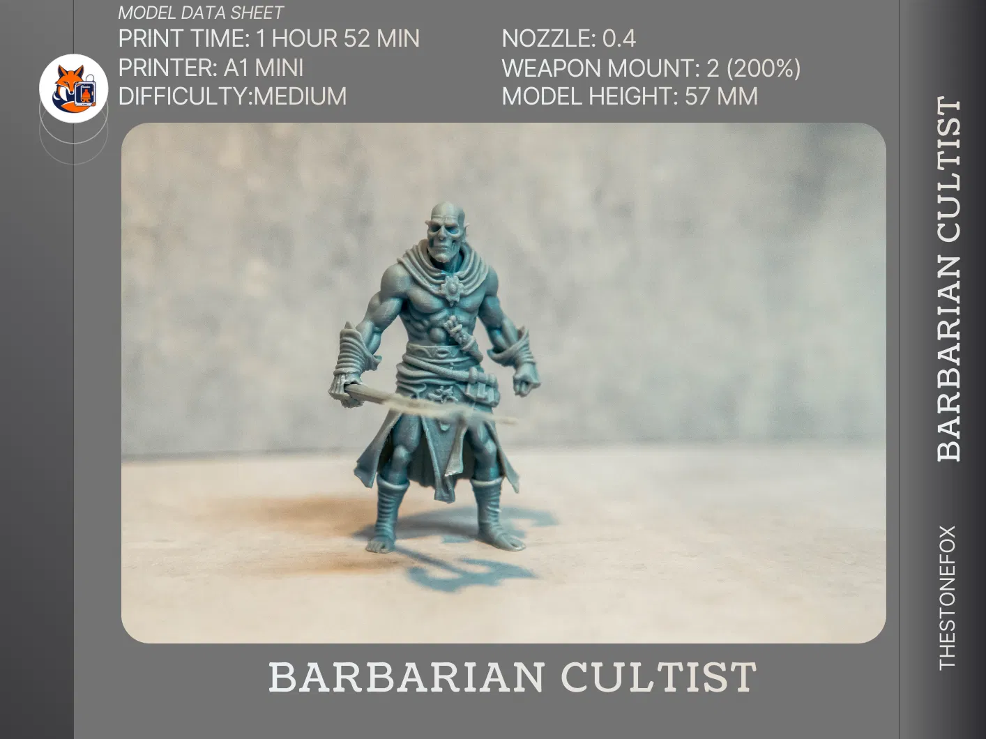 Mini DnD Barbarian Cultist trong series DnD Tavern, có hệ gắn vũ khí modular để đổi vũ khí nhanh khi chơi. Hỗ trợ hiệu ứng disarm/critical miss và đổi loadout. Vũ khí tải ở “The Armory”, nhớ scale theo level mount.