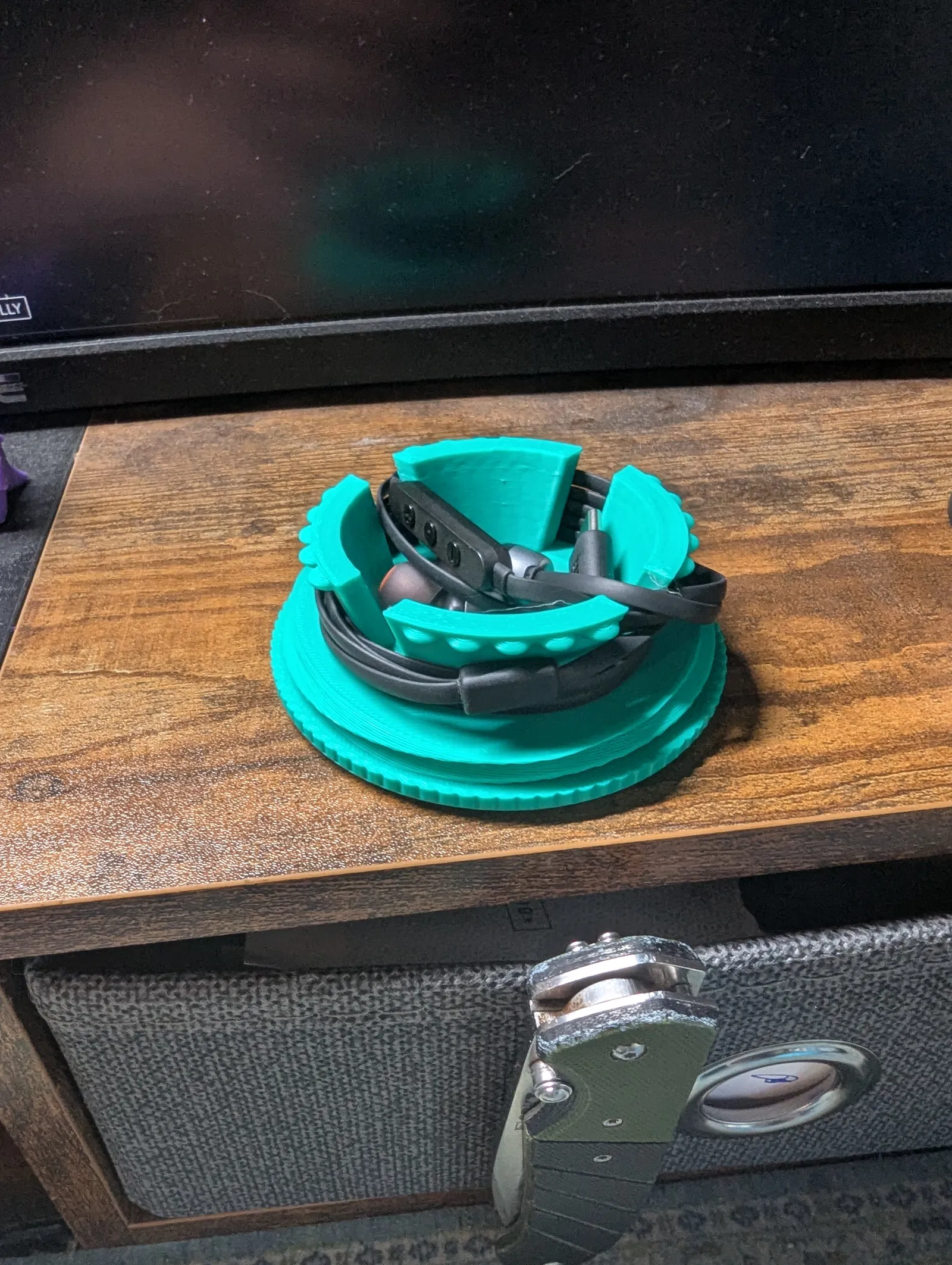 Bản remix của hộp/giá giữ tai nghe có dây của Luis Carlos Morales, được chỉnh để không cần supports khi in (tránh gãy phần đế). Thiết kế dạng hình nón và có beads ở viền trên giúp dây không bị trượt tuột.