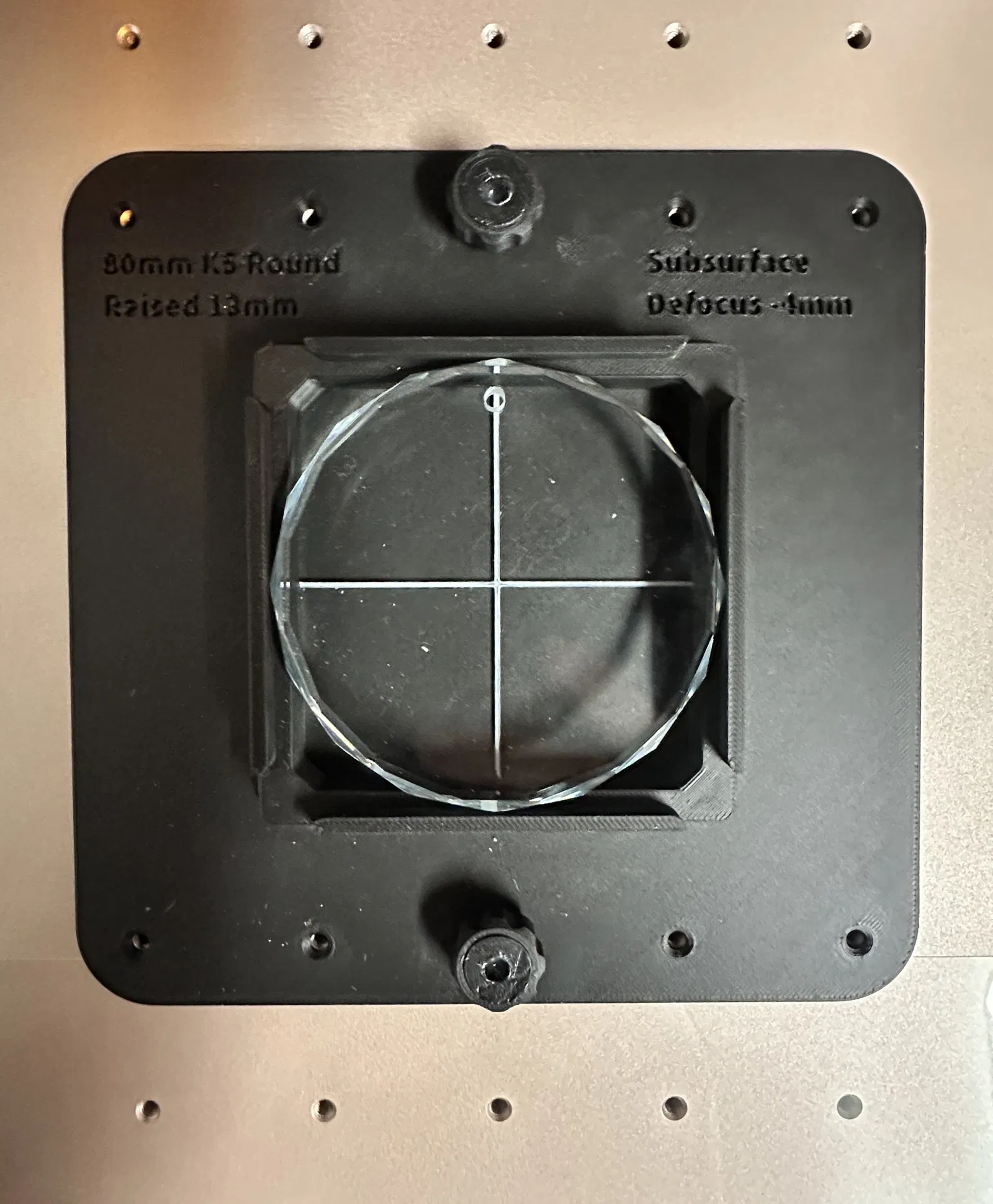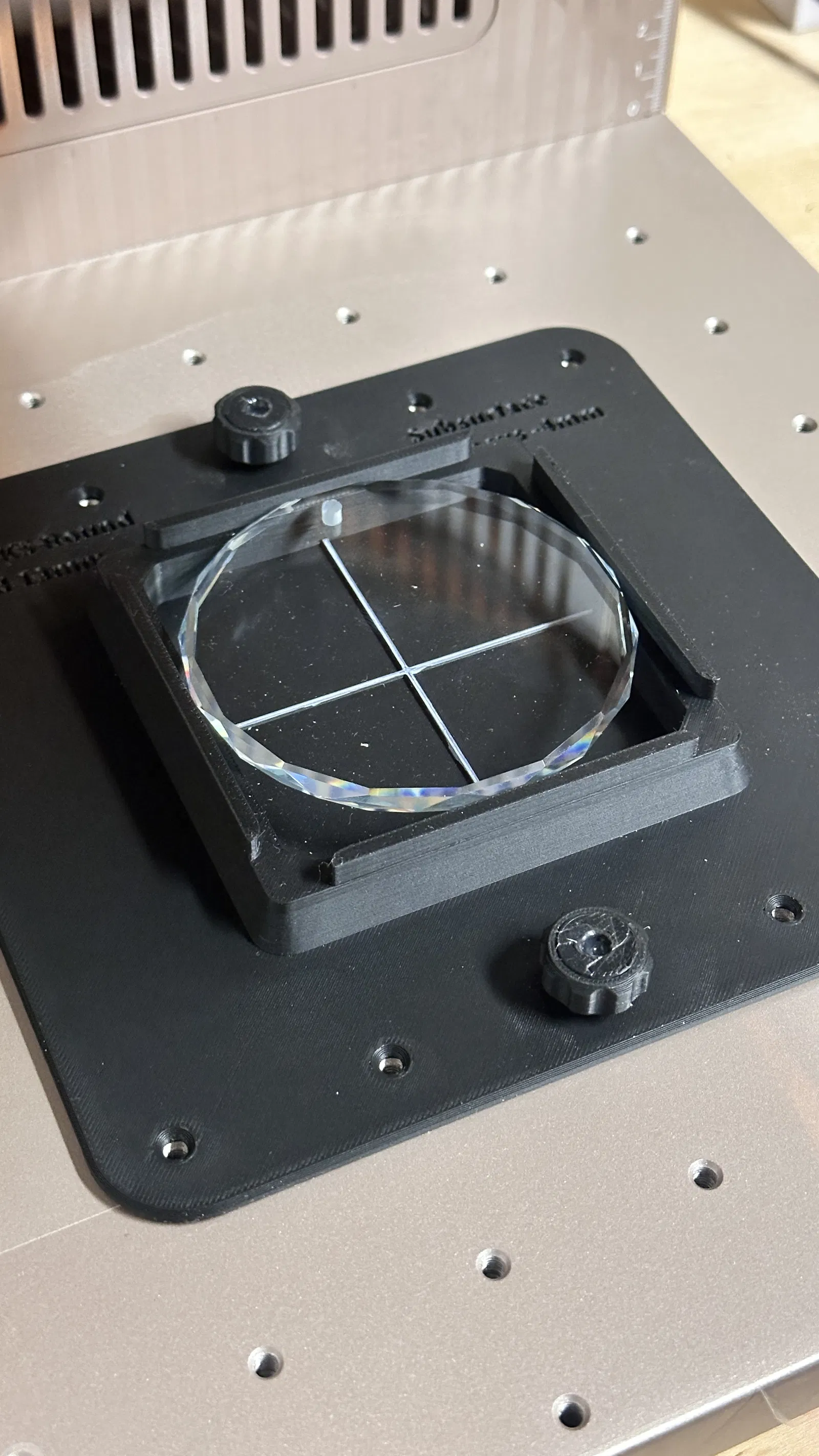 Jig dành cho Xtool F2 Ultra UV để cố định ornament pha lê K5 tròn 80mm, hỗ trợ khắc subsurface bằng cách kê cao và defocus -4mm. Cũng dùng được cho khắc bề mặt để canh tâm dễ hơn.