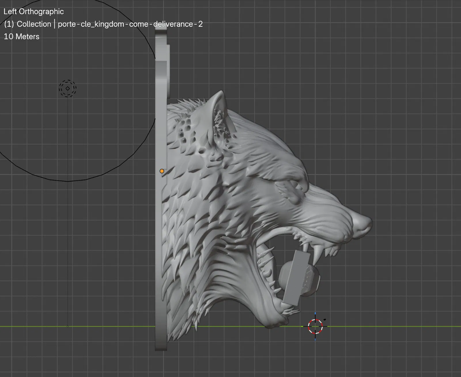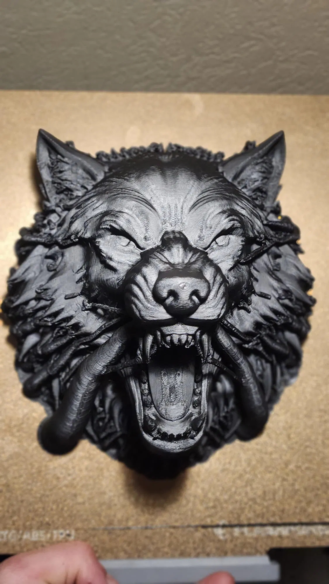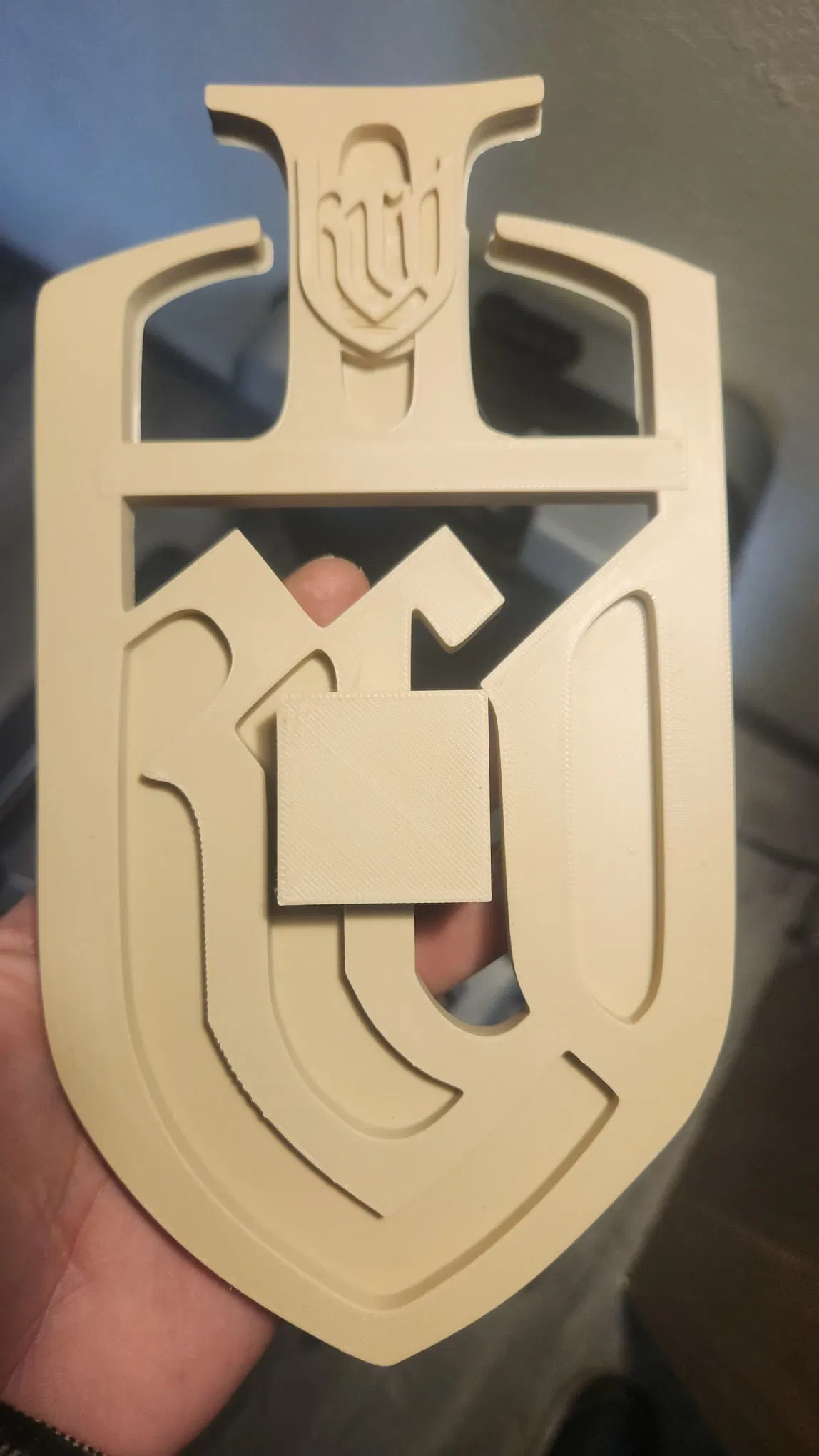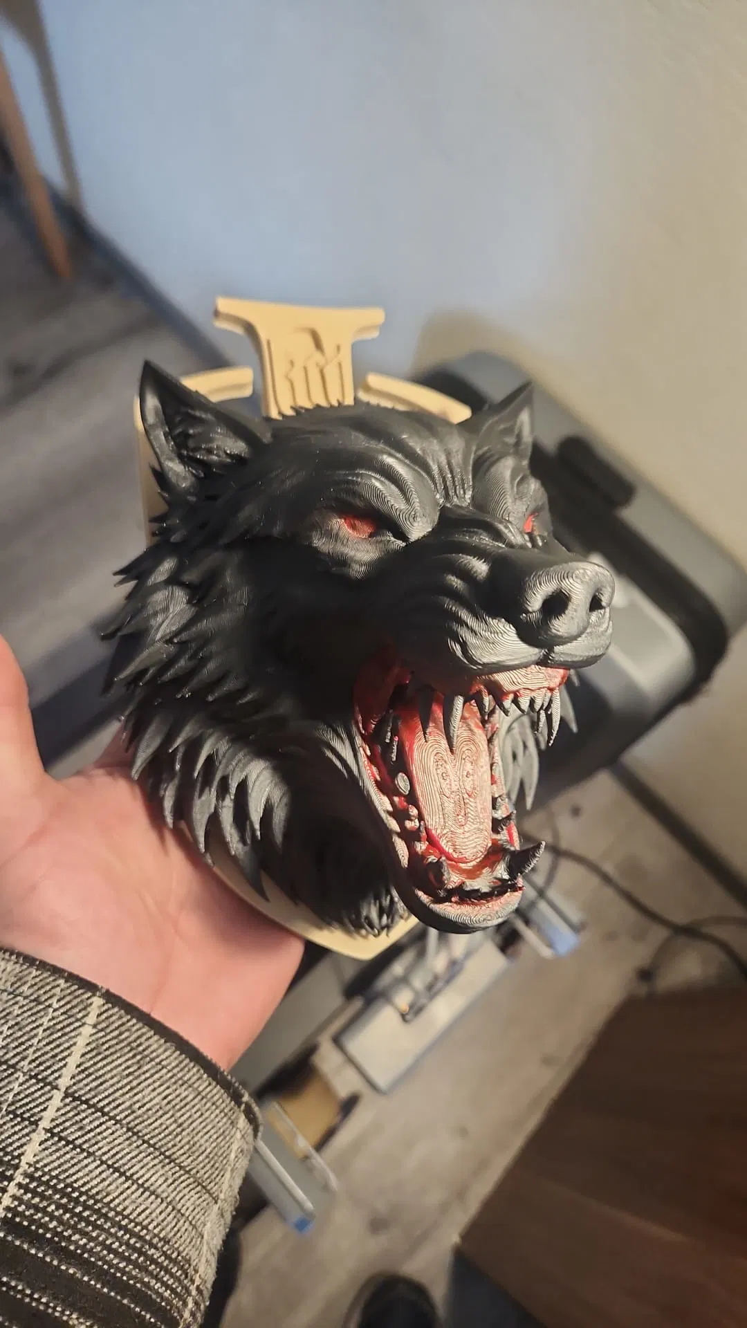 Giá đỡ đầu sói cho bản Philips OneBlade Kingdom Come: Deliverance 2 (limited). In đề xuất: 0.4 nozzle, 0.2 layer height, Gyroid; khiên dùng Grid. Sắp có thêm miếng lót TPU tăng độ chắc.