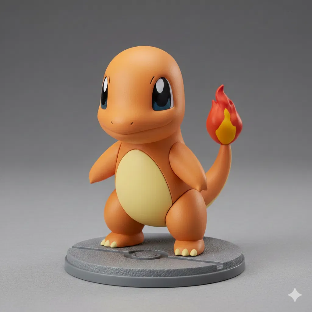 Mô hình 3D Charmander phong cách stylized theo thiết kế cổ điển Pokémon, tạo dáng thân thiện, mắt to biểu cảm và nụ cười dễ mến. Ngọn lửa trên đuôi là điểm nhấn, cho tổng thể ấm áp và đầy năng lượng.