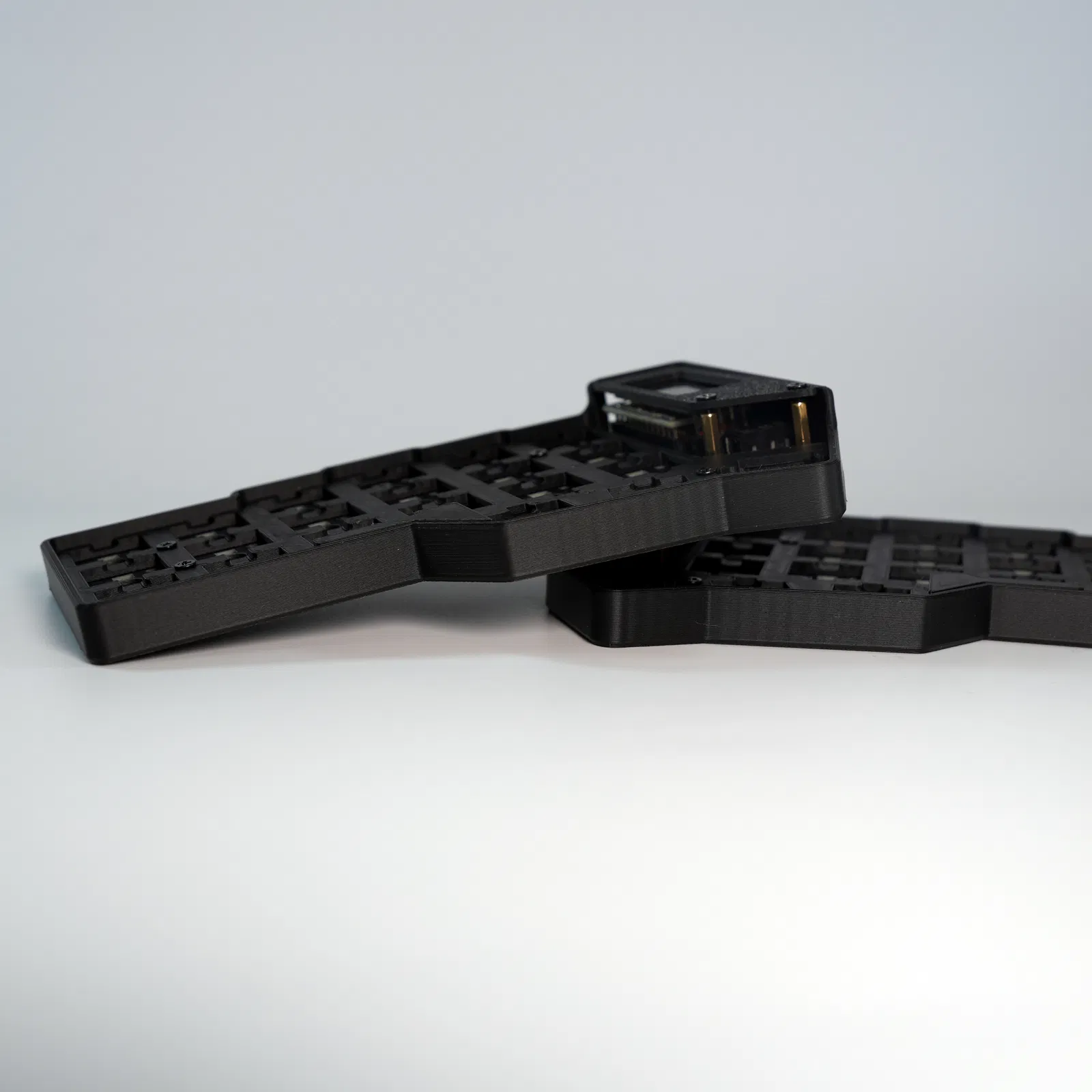Vỏ kiểu Batman được thiết kế cho bộ PCB Kit Corne V3 Choc của PandaKB. Tấm plate cho switch có các đường cắt relief để tháo switch ra dễ hơn.
