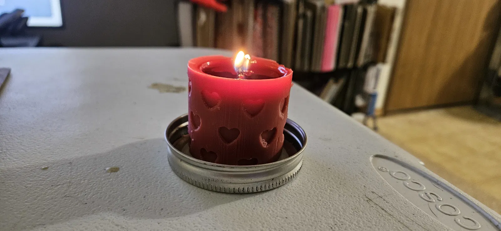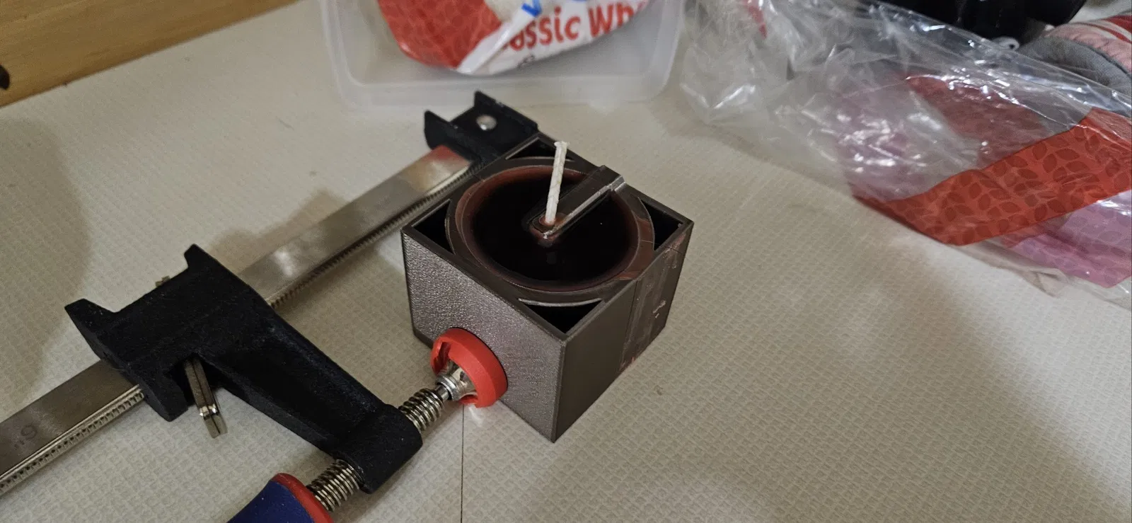 Mình đề xuất dùng thêm gì đó để giữ 2 nửa khuôn khép chặt lại, dù khuôn có mấy cái chốt gài nhỏ. Cá nhân mình dùng cái clamp, thấy ổn. Ngoài ra, nhớ canh mực sáp thấp hơn phần giữ tim nến (wick holder).