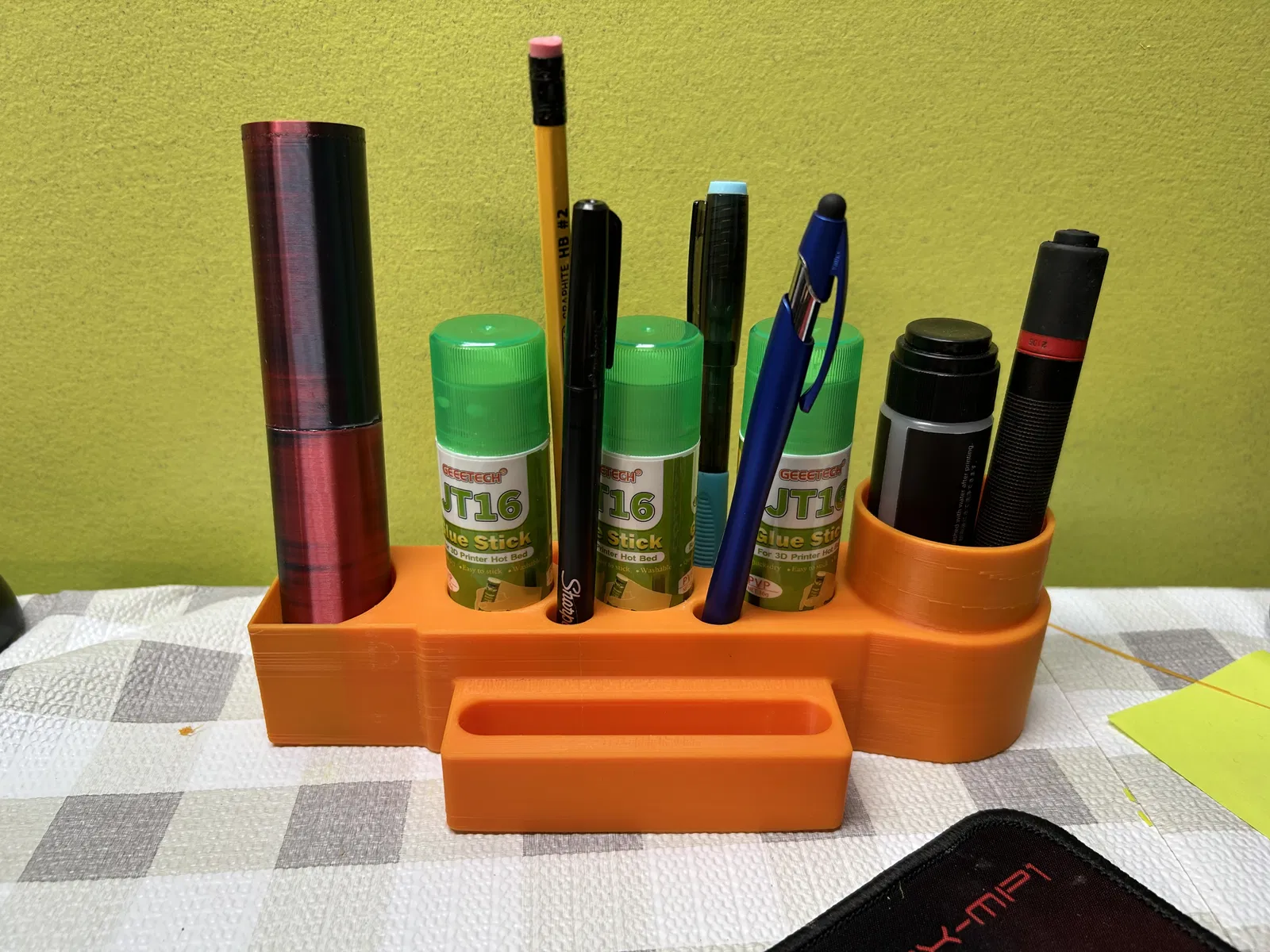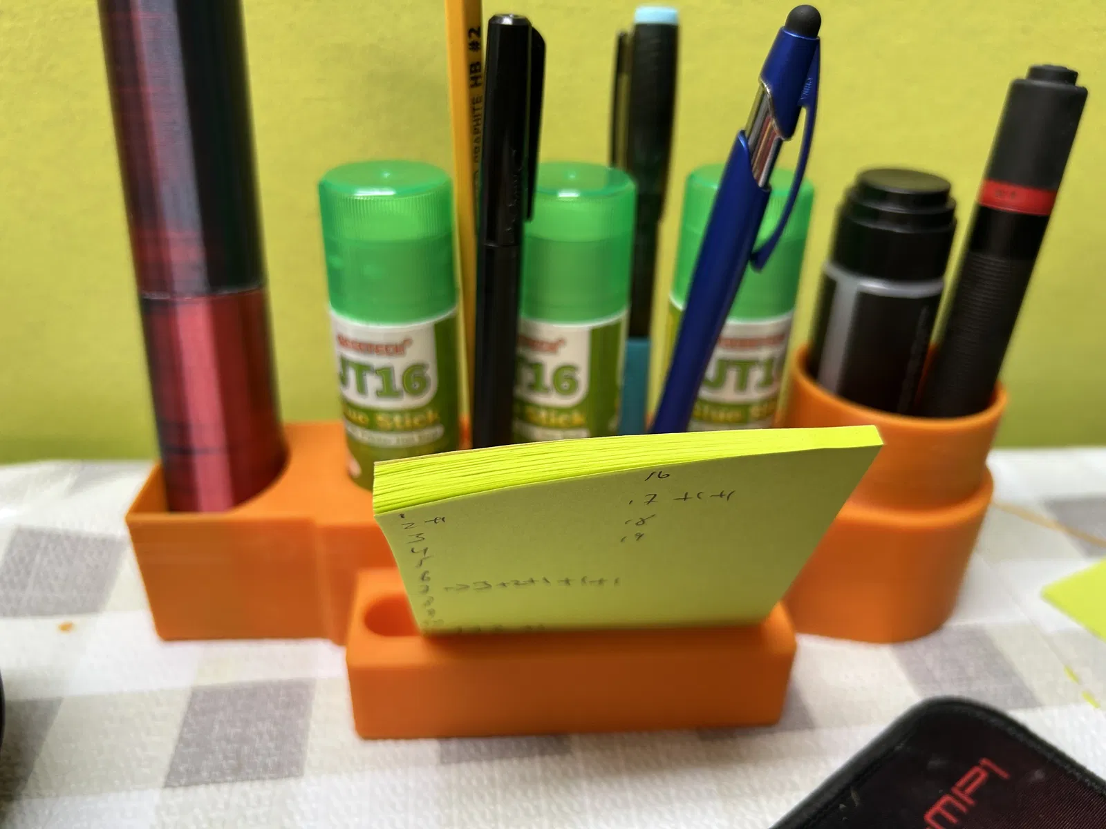 Mẫu “Glue & pen holder” là khay để bàn gọn gàng: đựng 3 keo thỏi, có chỗ cắm bút và ngăn để giấy note (sticky note). Phù hợp in 3D để sắp xếp góc học tập/làm việc.