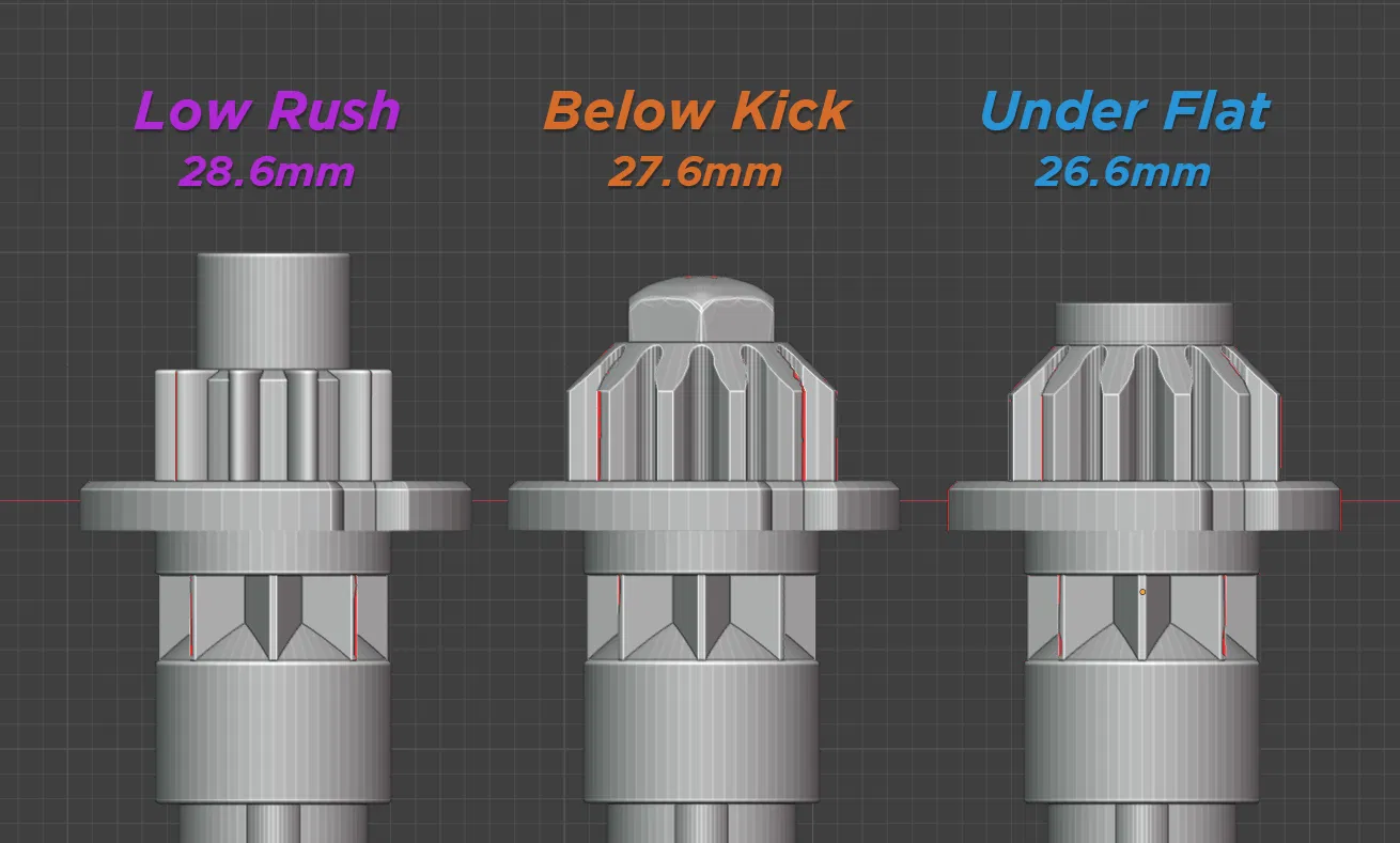 Below Kick là custom bit dùng cấu hình chuẩn 12-gear, có chiều cao được tinh chỉnh nằm giữa Low Bit và Under Bit, hướng tới hỗ trợ dòng CX. Phù hợp in PLA với layer 0.12 và infill Gyroid 50%.