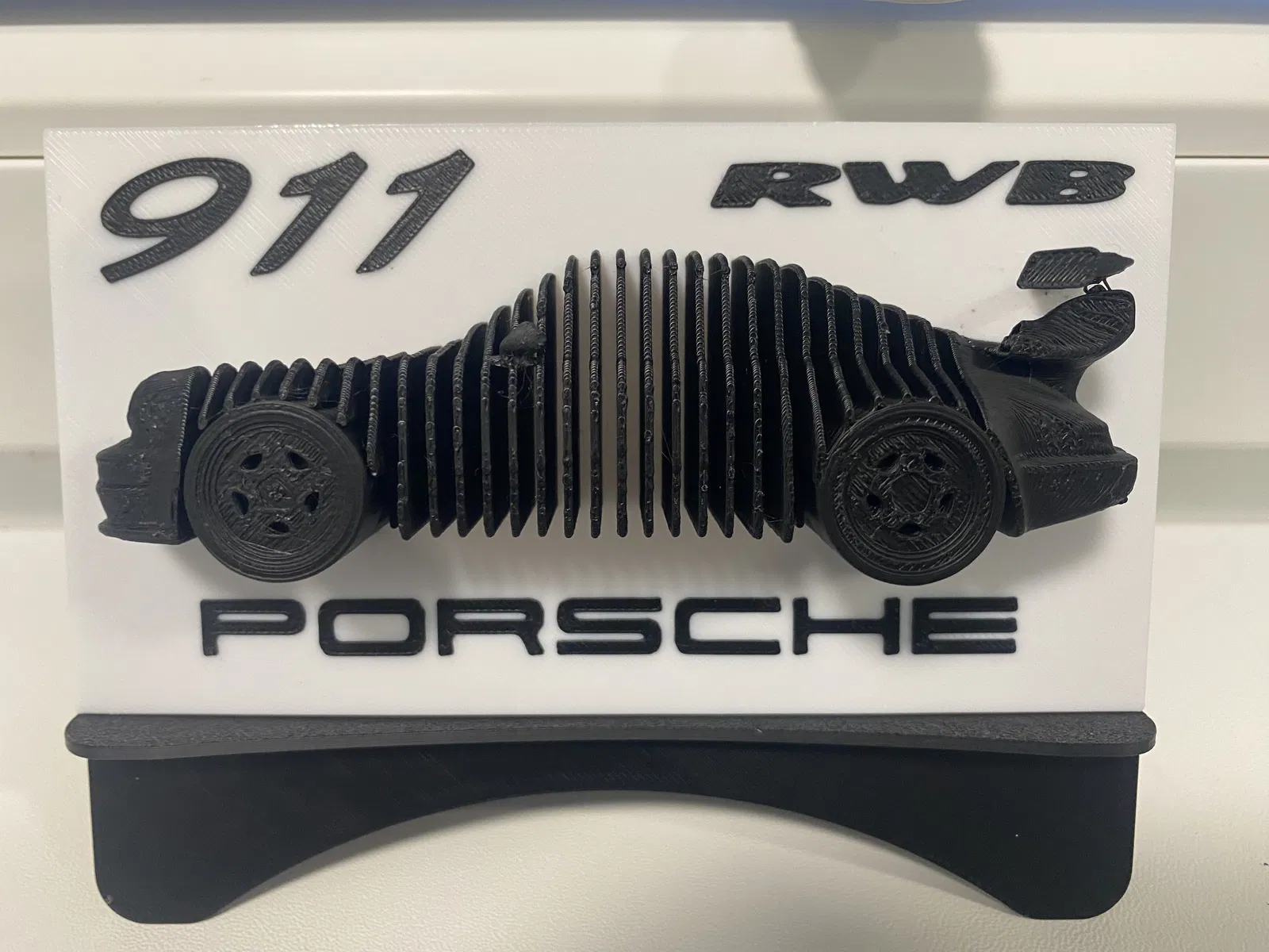Tác phẩm layered sculpture Porsche 911 RWB với bánh xe/mâm được làm nổi bật và chi tiết đầu/đuôi nhấn rõ. Có kèm file 3MF nhiều tuỳ chọn in; khuyên in 0.08mm, nozzle 0.2mm và gỡ supports thật nhẹ tay.