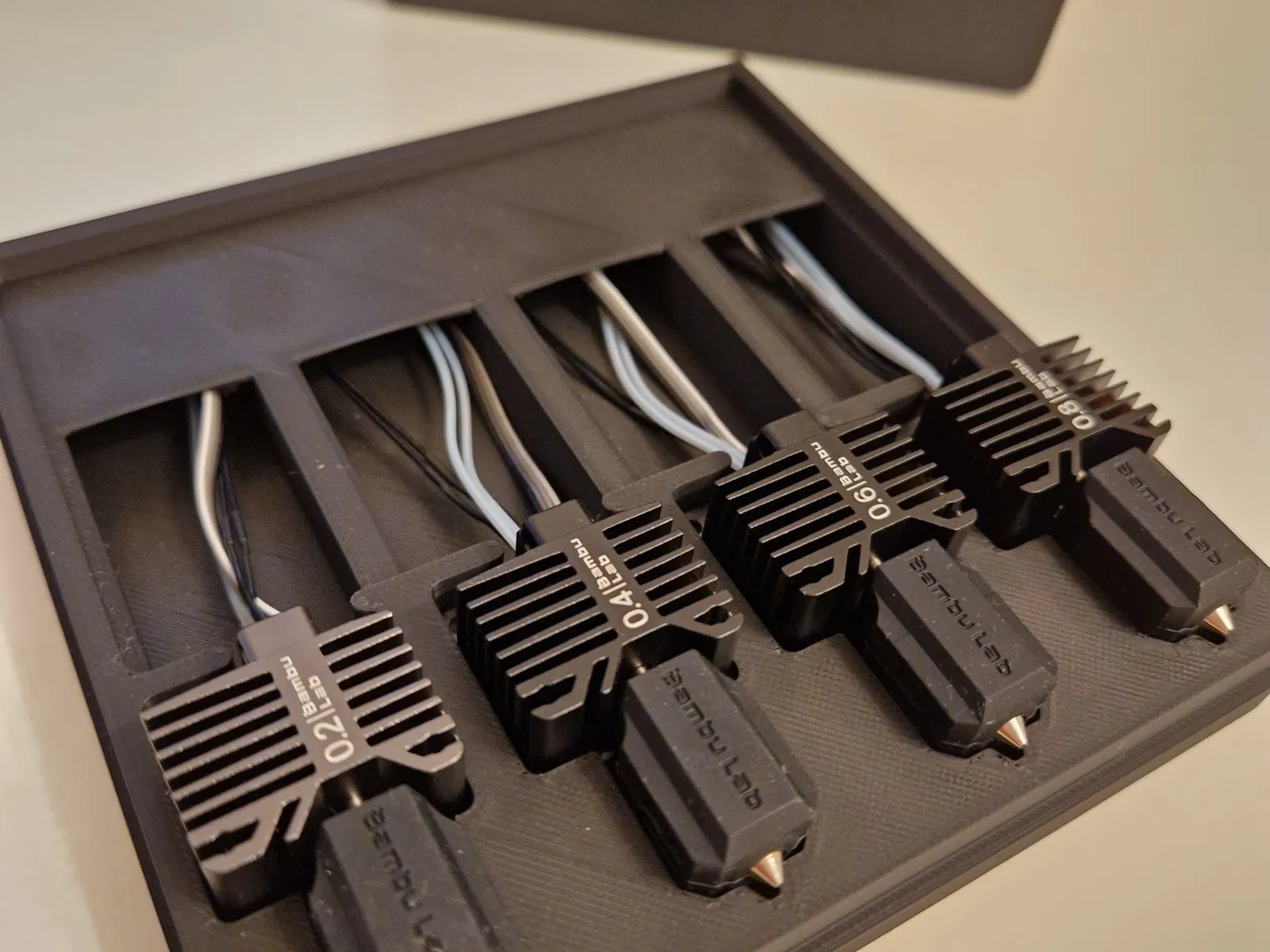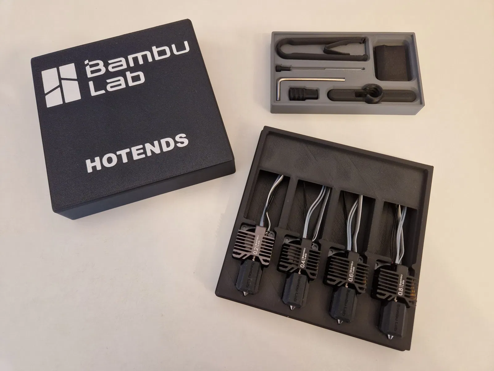 Hộp Bambu Hotends với các khay khác nhau Đây là một chiếc hộp nhỏ, đẹp mắt để lưu trữ 4 hotend Bambu đã được lắp ráp và một số công cụ bổ sung. Nó được thiết kế cho hotend X1 Carbon, nhưng cũng nên hoạt động với hotend P1P. Tính năng: - Lưu trữ lên đến 4 hotend đã lắp ráp hoàn toàn