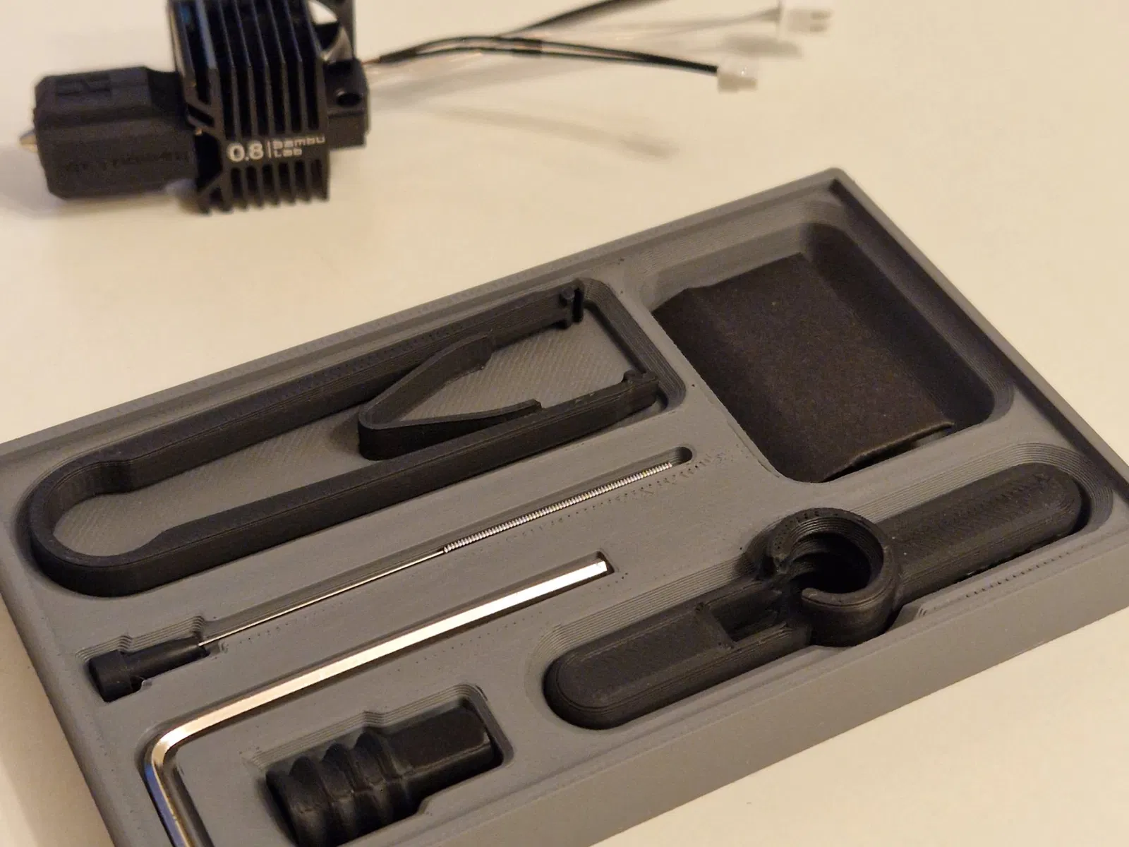 - 1 ngăn tùy chỉnh, chứa các dụng cụ sau: - Chìa khóa lục giác - Kim để làm sạch vòi (đi kèm với máy in) - Dụng cụ - Chìa khóa lục giác T-Griff này - Một ngăn cho phụ kiện nhỏ hơn (ví dụ: một vài ốc vít thay thế)