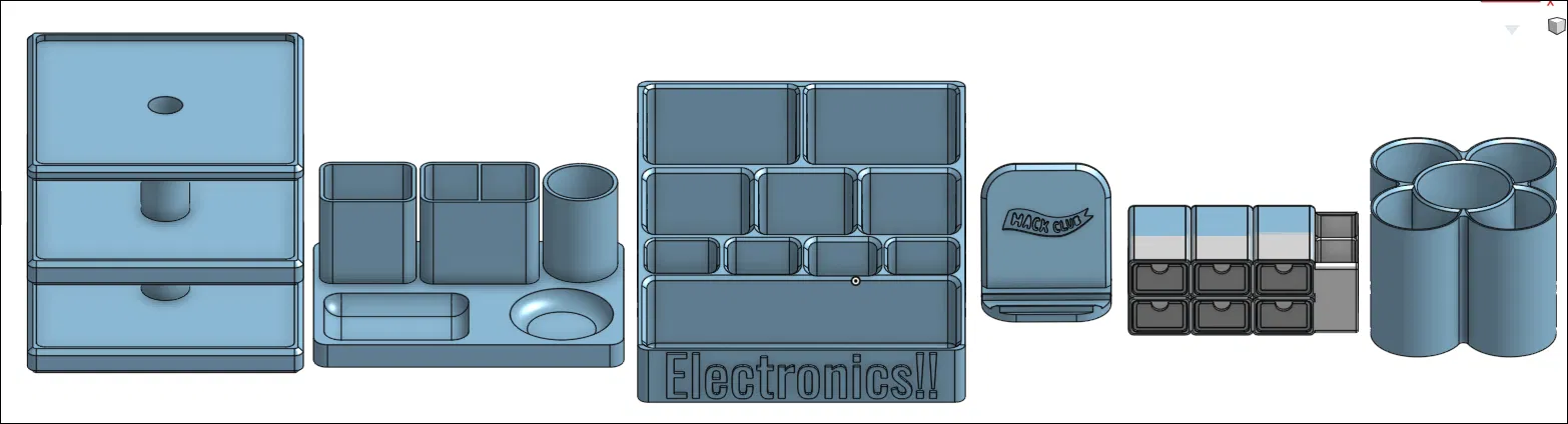 Bộ sưu tập nhiều kiểu desktop organizer cho các nhu cầu sắp xếp khác nhau. Riêng mẫu này cần 6 ngăn kéo để lắp ráp, còn các mẫu khác trong bộ thì là model một phần, in một lần là dùng được.