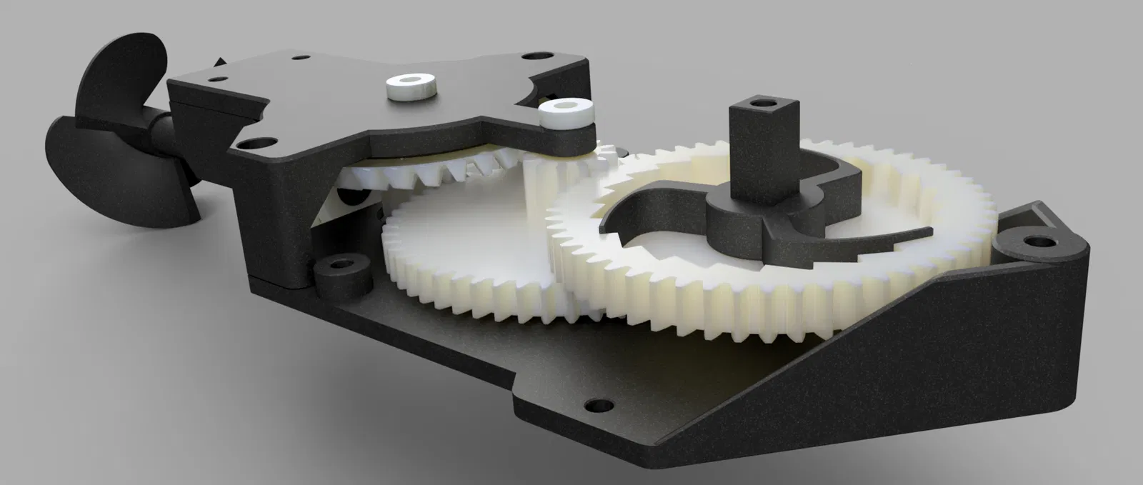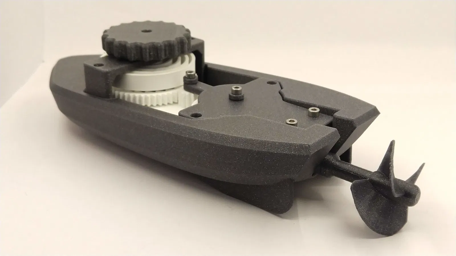 Thay đổi lớn nhất nằm ở cụm truyền động (transmission). Tất cả bánh răng đã được thiết kế lại. Để đổi hướng ở phía sau, mình dùng spiral bevel gear, tạo ma sát cực kỳ thấp. Nó được thiết kế sao cho lực dọc trục (axial force) đẩy về phía sau, và ma sát phát sinh gần như được triệt tiêu bởi lực phản từ chân vịt (propeller) khi chạy trong nước. Chạy dưới nước thì phải nói là tuyệt vời! Các bánh răng giờ đều có thêm counter bearing, nên hiện tượng nghiêng và ma sát đi kèm đã được ngăn lại. Vì vậy toàn bộ truyền động hiệu quả hơn nhiều, chạy nhanh hơn và lâu hơn theo hướng thẳng, không còn kiểu “quậy” khi kéo lên cót. Một thiết kế win-win-win. :)