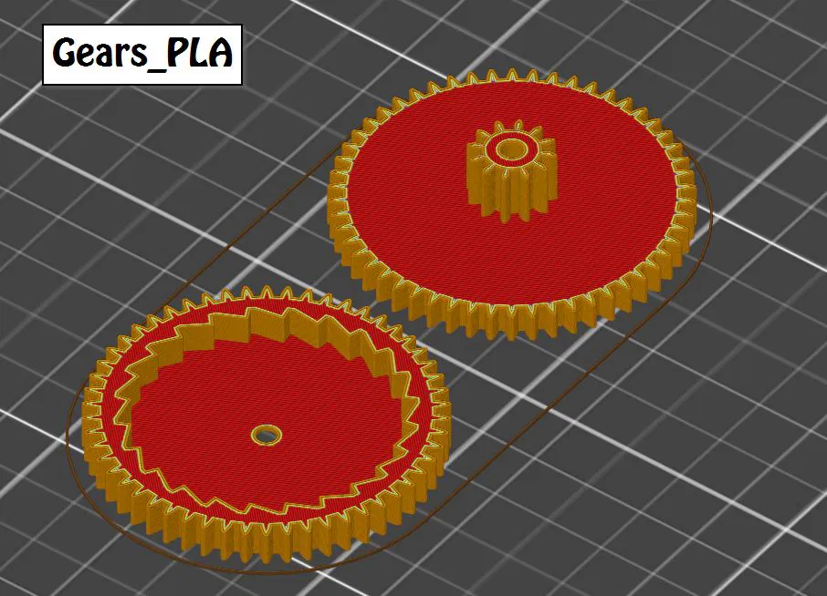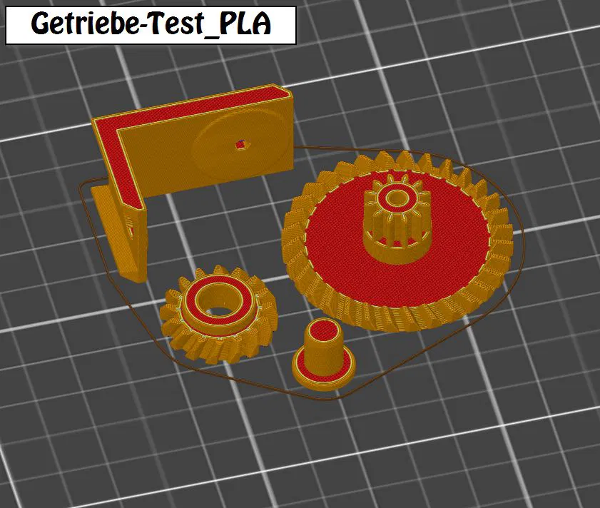 Để kiểm tra xem thiết lập in của bạn có đúng không, mình có làm một functional benchmark nhỏ. Bạn cần in các bánh răng quan trọng nhất — bevel gears — và một cái holder nhỏ có kèm chốt. Lắp lại và thử vận hành. Hãy chỉnh first layer và extrusion multiplier sao cho hai bánh răng ăn khớp nhẹ nhàng, rồi in phần còn lại của model với đúng các thiết lập đó. Cực kỳ quan trọng là hai bánh răng này phải chạy mượt. Vì vậy hãy bắt đầu bằng benchmark. Khi chạy ổn rồi, bạn có thể dùng chính các bánh răng đó cho thuyền.