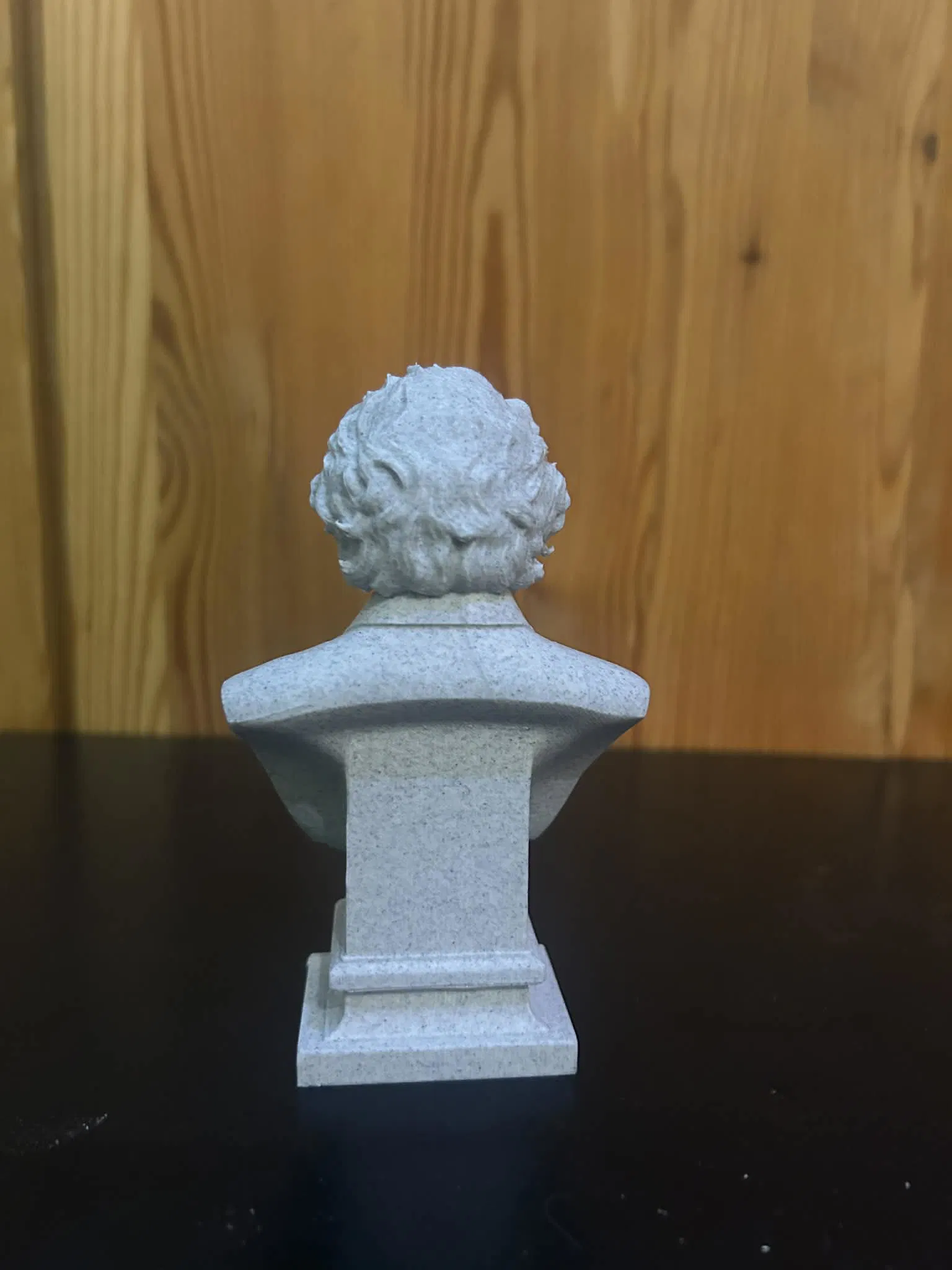 Kết cấu điêu khắc làm nổi bật sự linh hoạt trên gương mặt: gờ chân mày rõ, nụ cười nhẹ, các nếp nhăn quanh mắt được nhấn mạnh. Tổng thể vẫn giữ sự trung tính về hình khối, nhưng vẫn để lộ cá tính đam mê và giàu sức lan tỏa của nhà khoa học.