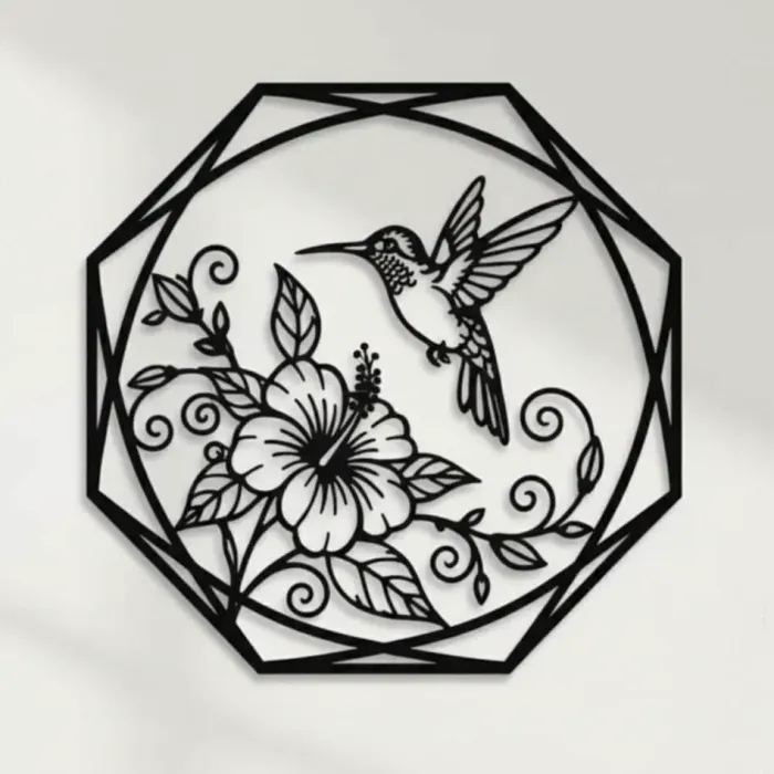 Thiết kế chim ruồi (humming-bird) bay lơ lửng trên hoa dâm bụt trong khung trang trí, đường nét tinh xảo. Thích hợp làm đồ treo tường hoặc đĩa trang trí, tạo điểm nhấn thanh lịch, đậm chất thiên nhiên cho không gian.