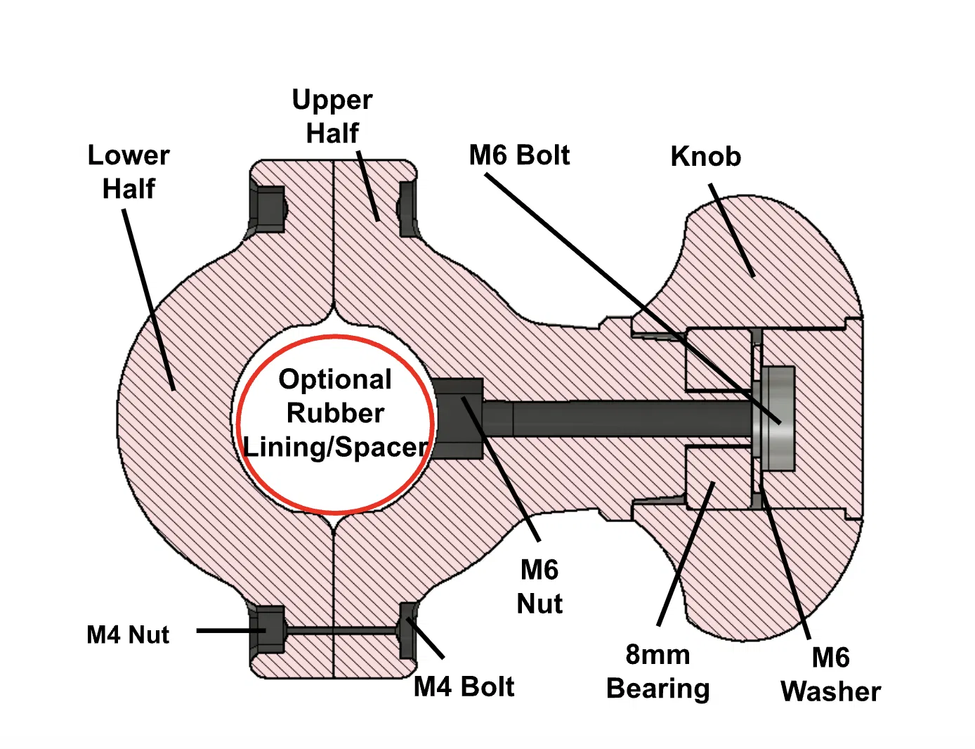 Thay vì phải tạm dừng khi in để đặt bearing vào rồi in phủ lên. thiết kế của mình cho phép thả bearing vào đúng vị trí sau khi in xong. Phần nút bịt (knob plug) được dán cố định bằng một ít keo CA.