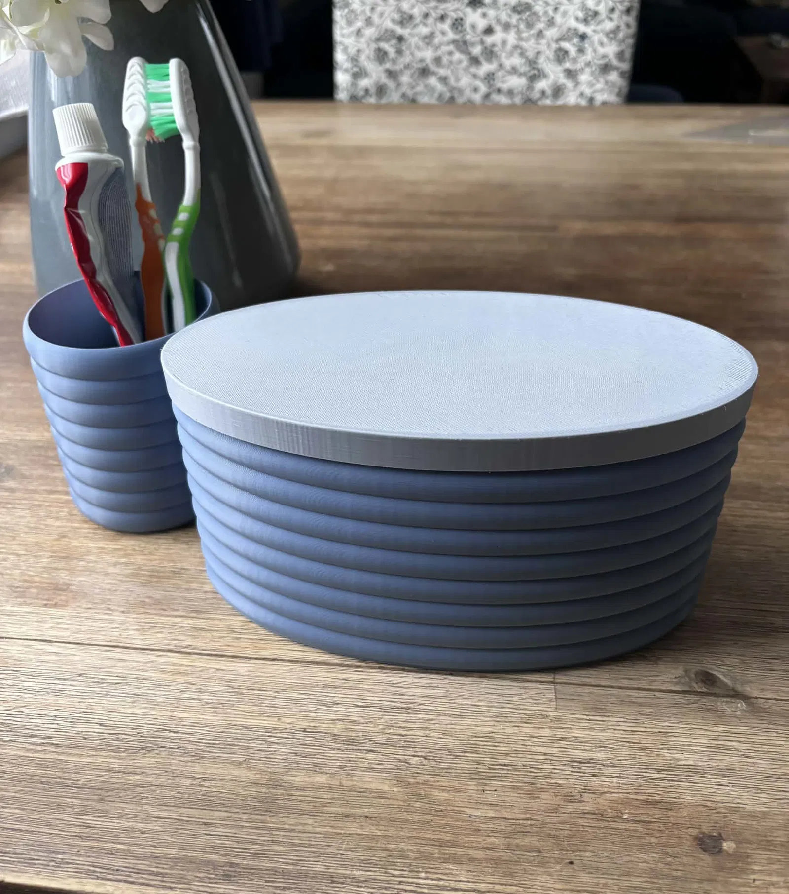Bộ 2 món CLOUDIE gồm giá đựng bàn chải và kem đánh răng (Ø 8 x cao 9,2 cm) và hộp oval lớn nắp bản lề (20 x 10 x 10,4 cm). Thân và nắp in riêng, ráp bằng ngàm snap.