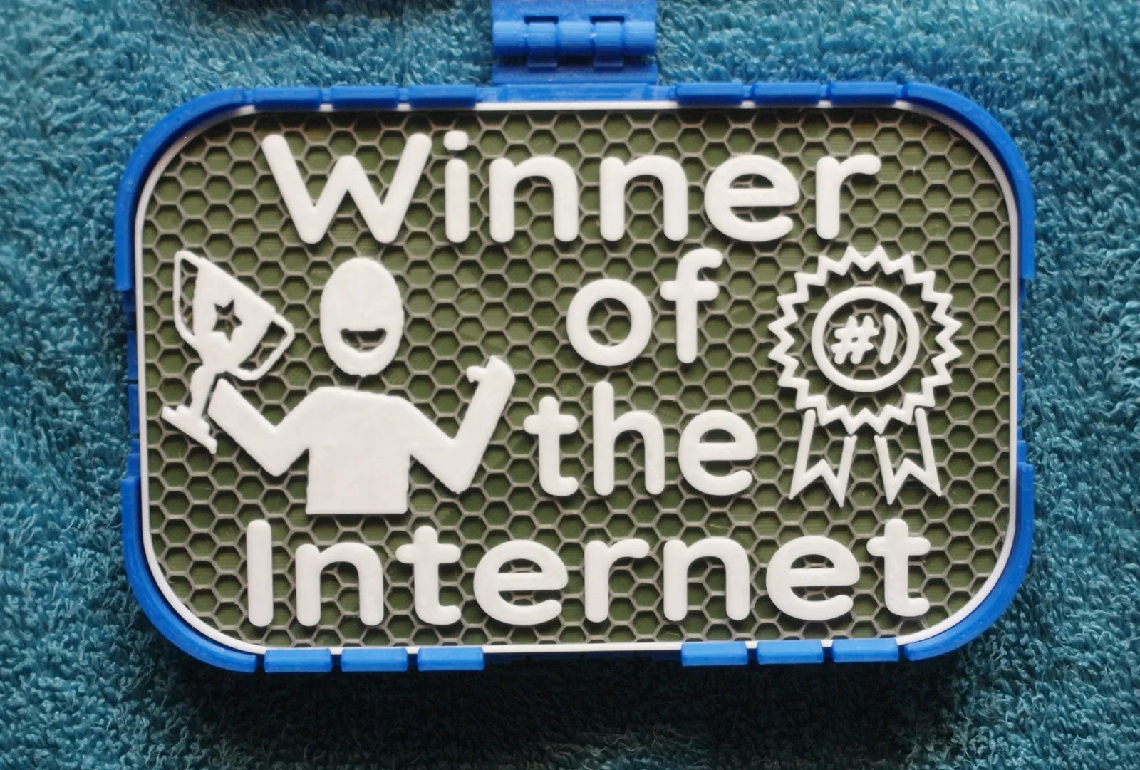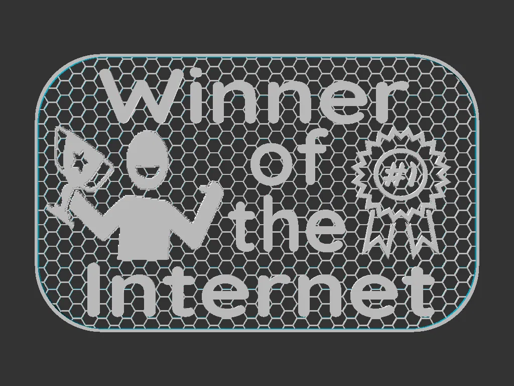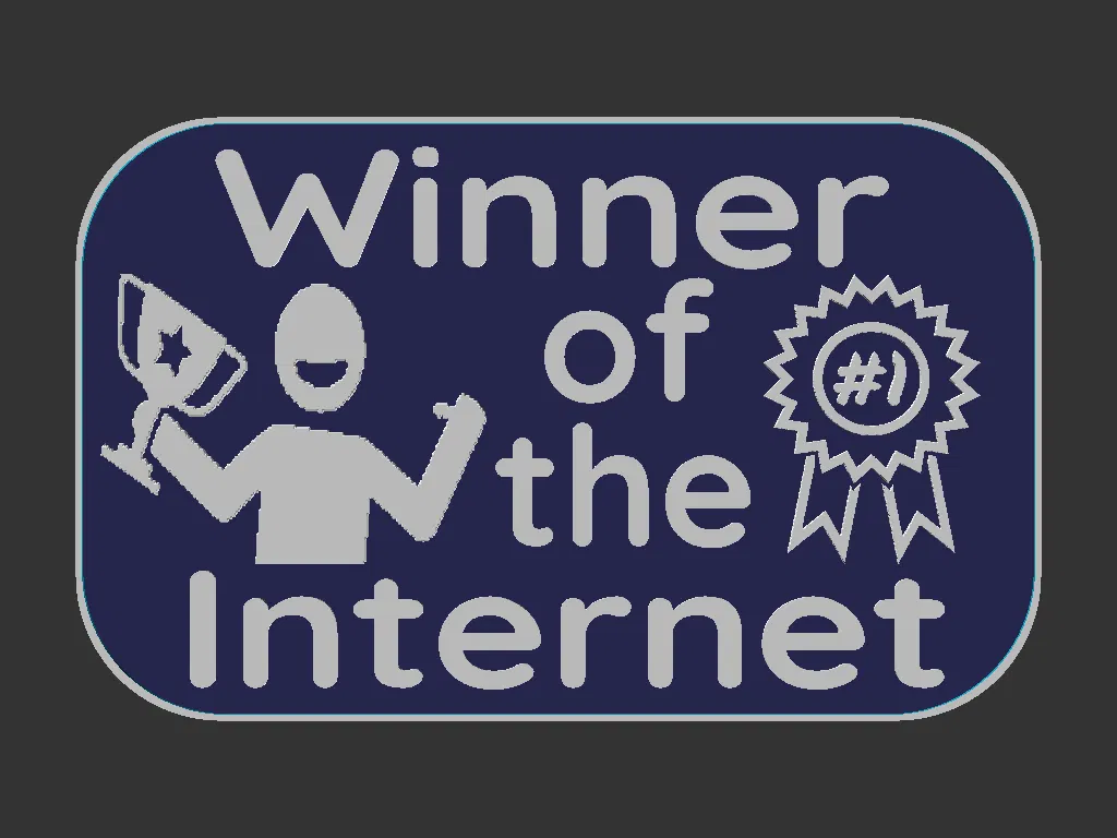 Mẫu bảng hiệu 100x160mm với chữ “Winner of the internet”, kèm minh hoạ người cầm cúp và ruy-băng giải thưởng. Có cả file Mesh và Solid; khuyến nghị đổi màu trên 1mm (có gcode kèm theo).