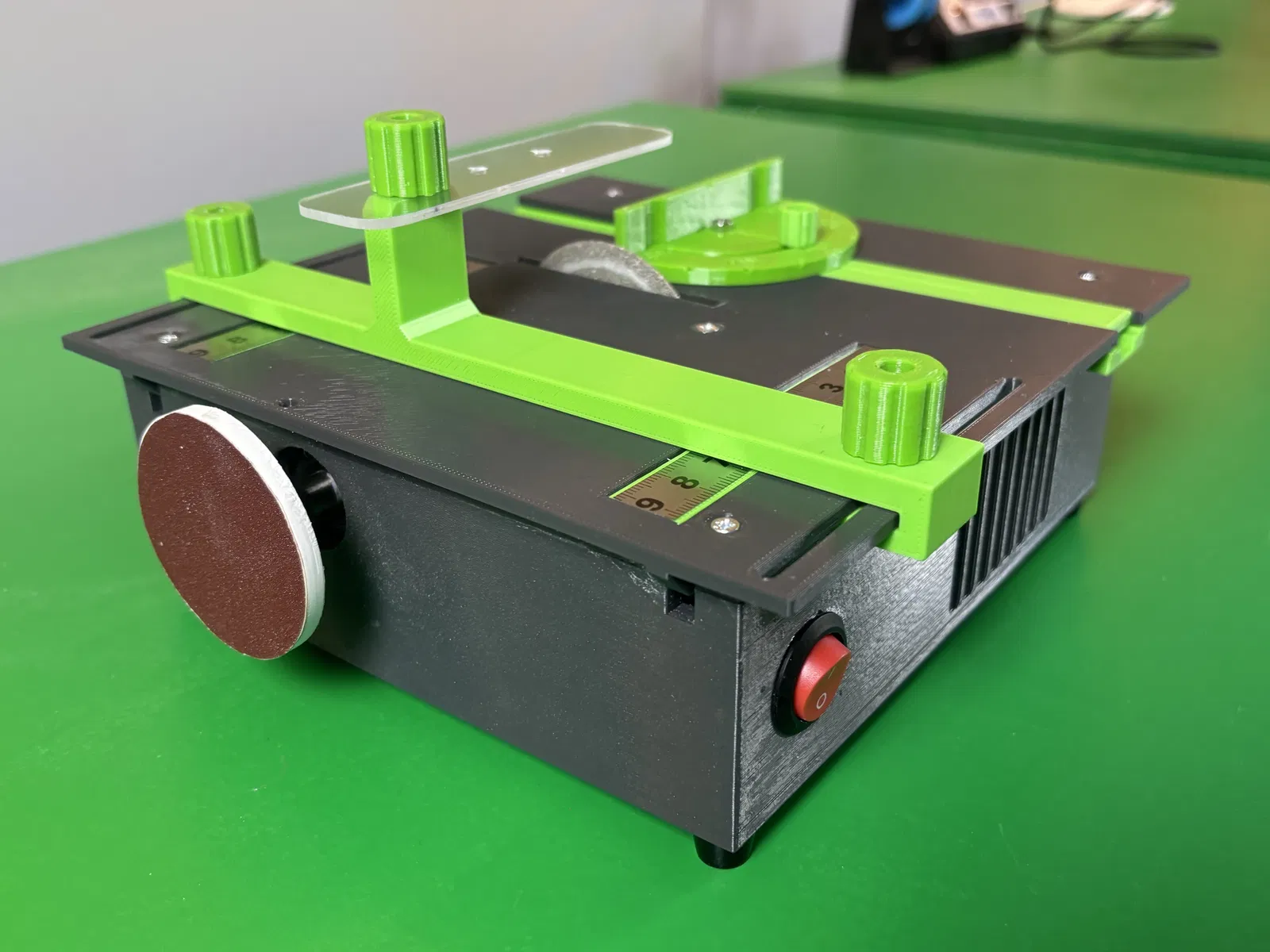 Bản chỉnh sửa mini table saw để dùng lưỡi cưa lỗ 16mm: nâng đế 5mm, đổi công tắc và cổng nguồn dạng tròn, dời lỗ lưỡi cưa, chỉnh motor-mount-part-1 và thu nhỏ rulerpart. Các phần khác giữ nguyên.