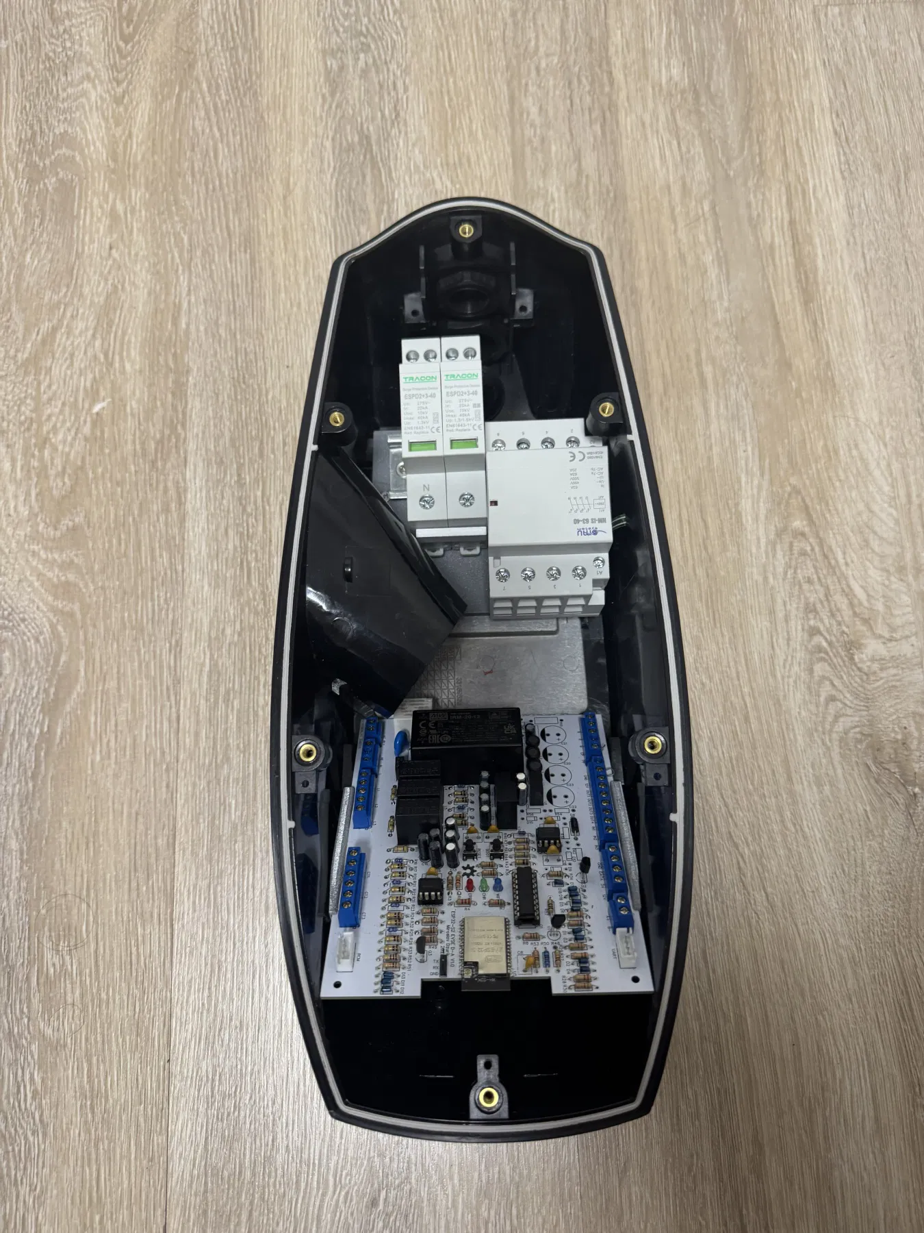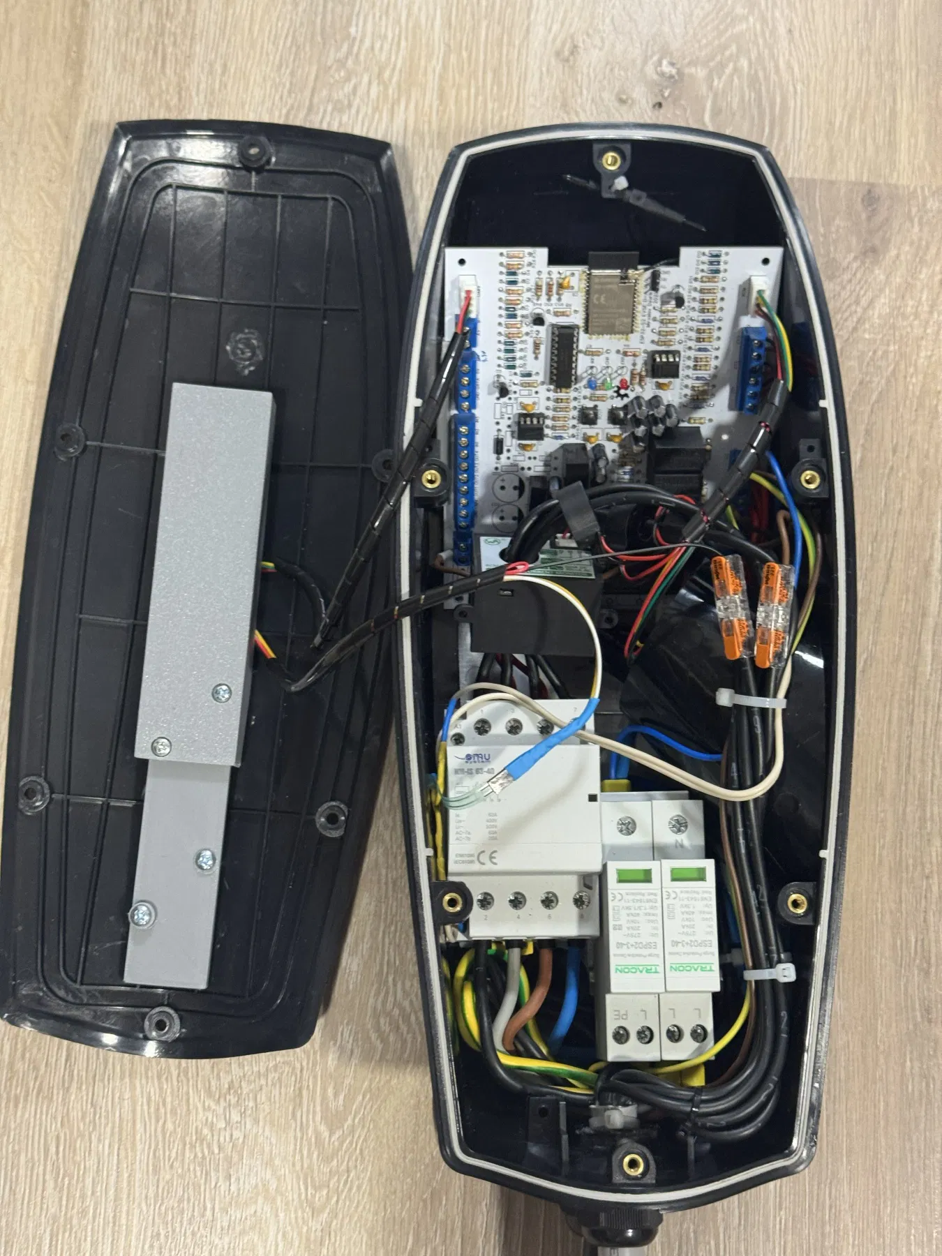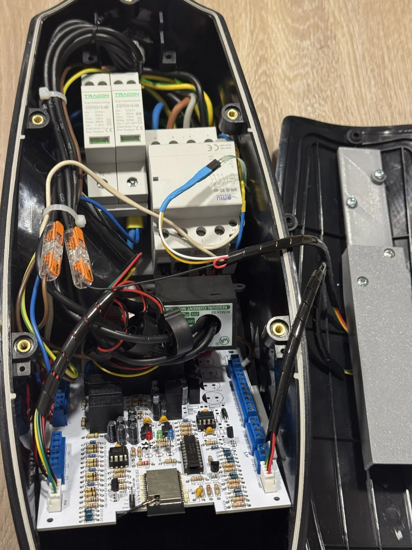 Cái hộp này chứa ESP32‐S2 EVSE DIY ALPHA rất vừa. Bo mạch nằm gọn ở phần trên của hộp, còn contactor và bộ chống sét (tuỳ chọn) có thể đặt ở phần dưới. Khoảng giữa vừa đủ để đặt RCM và các current transformer.