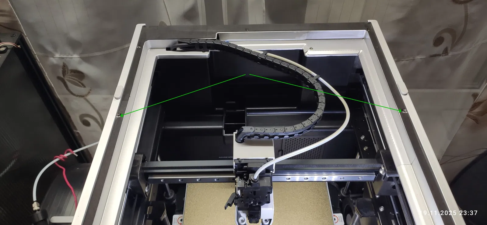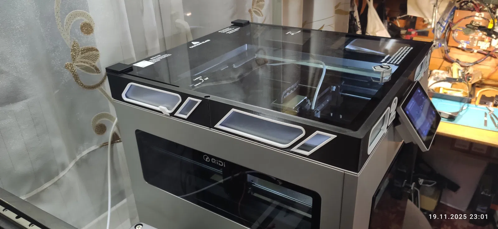 Tháo (vặn ra) các vít (2 cái) cố định nắp trên. Đặt raiser vào và bắt lại bằng các vít vận chuyển trước đó dùng để cố định bàn in. Khi lắp cũng cần mica (orgglass/plexiglass); các rãnh đã được thiết kế sẵn: 185x40x3mm ở hai tấm bên và 140x40x3mm phía trước. Vì vậy cắt tấm mica nhỏ hơn kích thước này khoảng 1–3 mm. Phần dưới kính được giữ bằng miếng chèn, tốt nhất dán bằng keo cyanoacrylate. Các miếng ốp che “cửa sổ” cũng nên dán cố định.