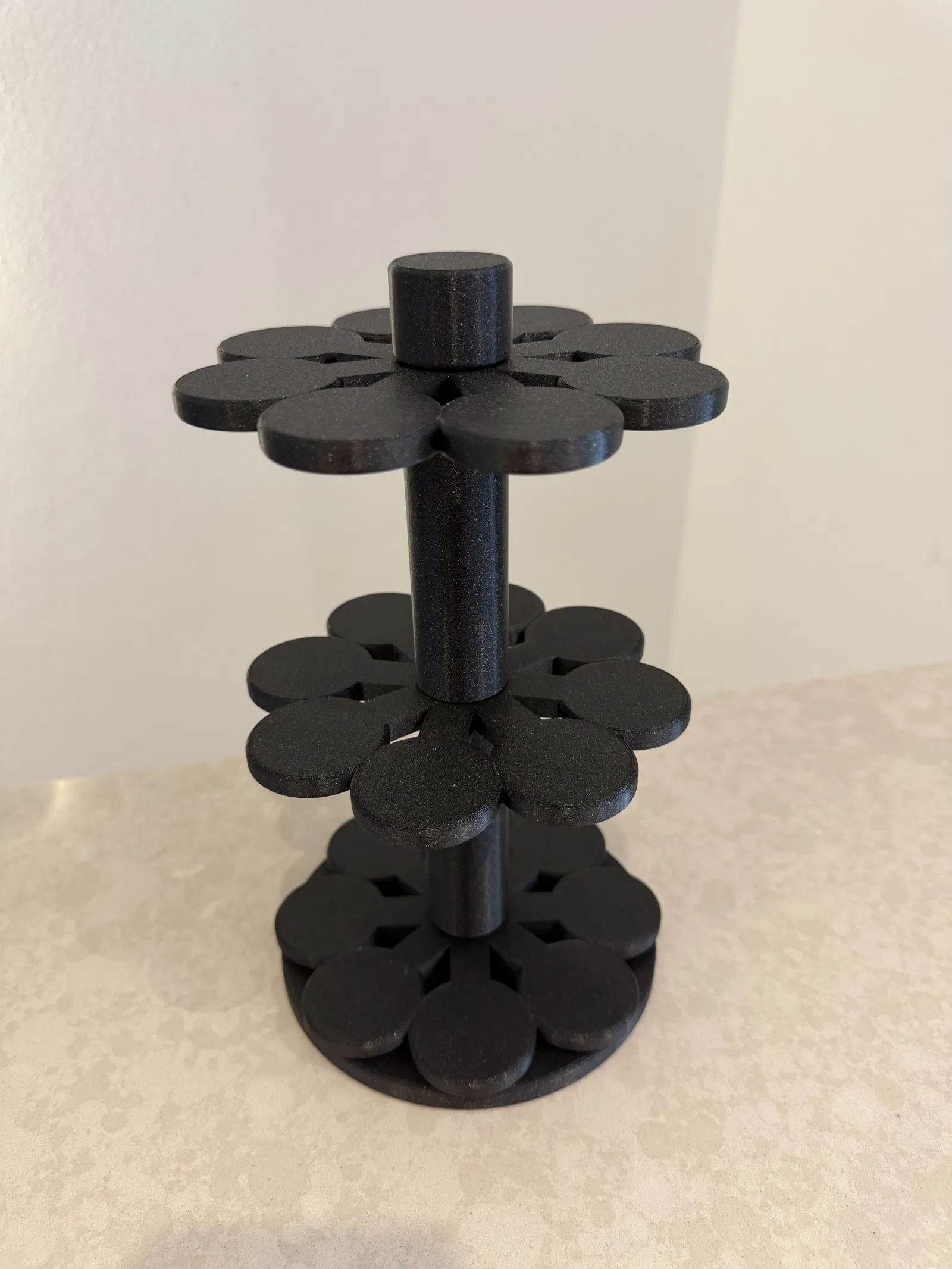 Cột giữa được bắt vít cố định, tạo thành một lõi cực chắc để bạn có thể cầm nguyên cái tháp xách/đem đi luôn. Các tầng (“bông hoa”) tựa trên các vòng chạy (bearing ring) đặc biệt và có thể xoay độc lập với nhau.