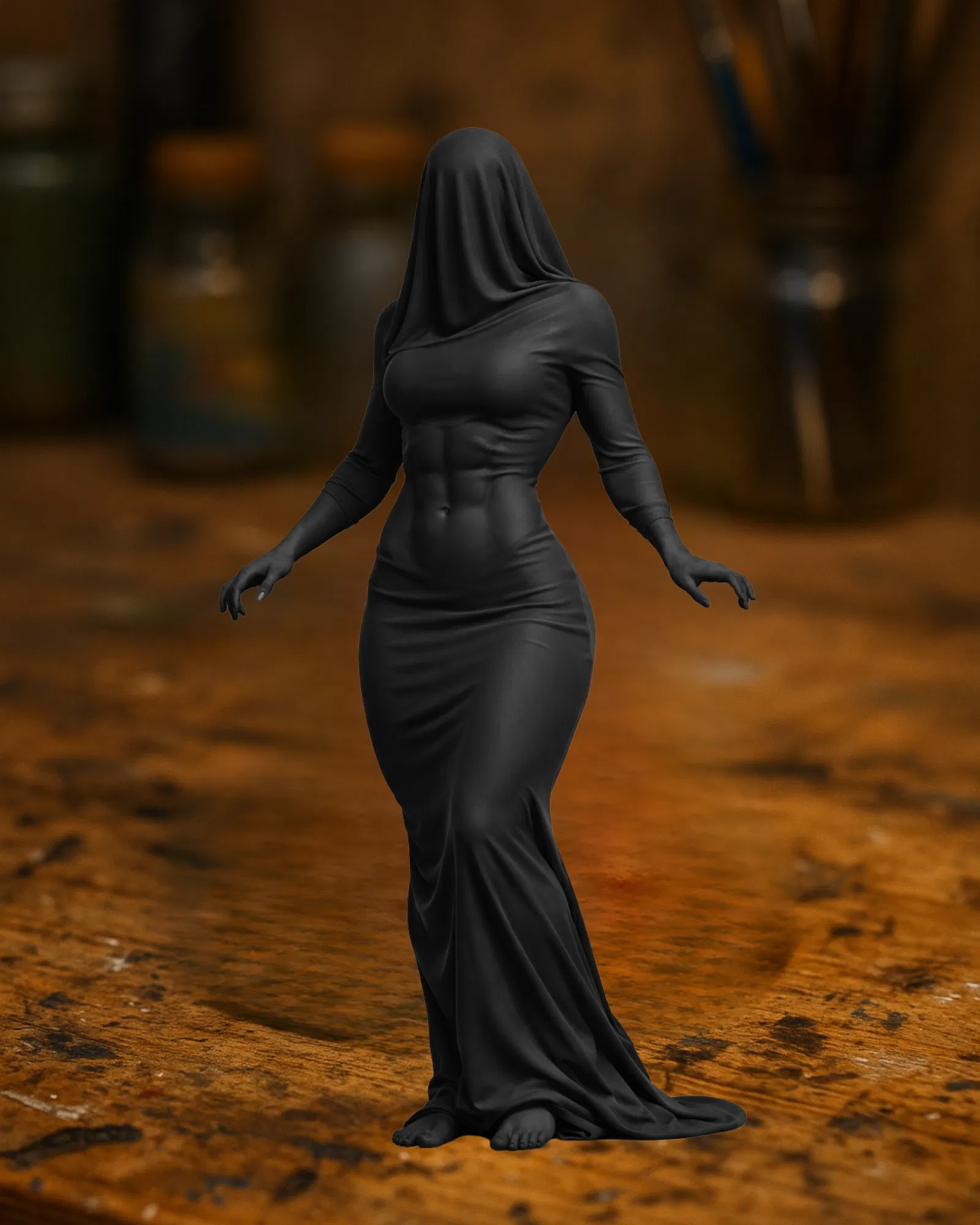 Mẫu tượng người phụ nữ không gương mặt, phủ bởi lớp màn tối uốn lượn và không khí tĩnh lặng. Hợp làm decor phong cách gothic/dark, tạo vibe huyền bí, rùng rợn mà vẫn cuốn hút.