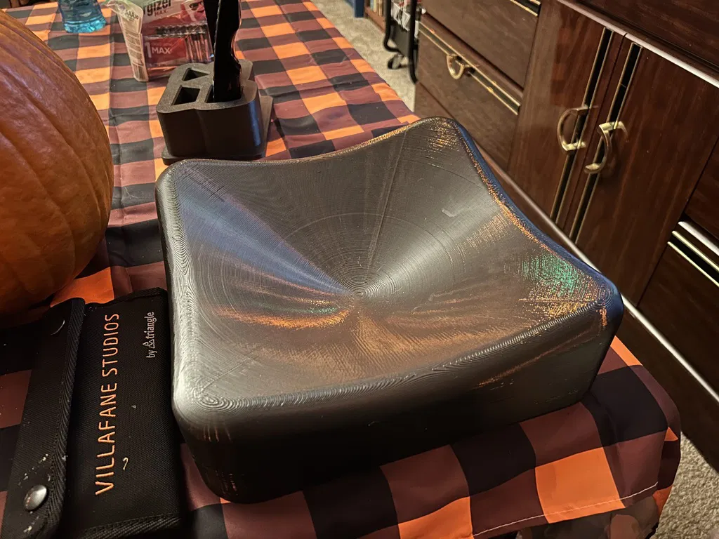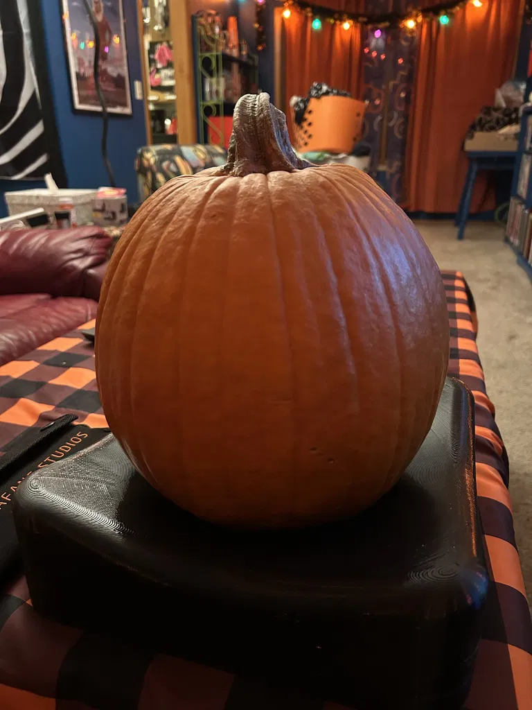 Đồ kê giúp cố định và xoay bí ngô dễ dàng khi khắc jack-o’-lantern. In kích thước lớn nhất máy cho phép hoặc nhỏ tùy nhu cầu. PLA dùng ổn, infill 15% là đủ; có thể phủ Krylon clear enamel chống ẩm.