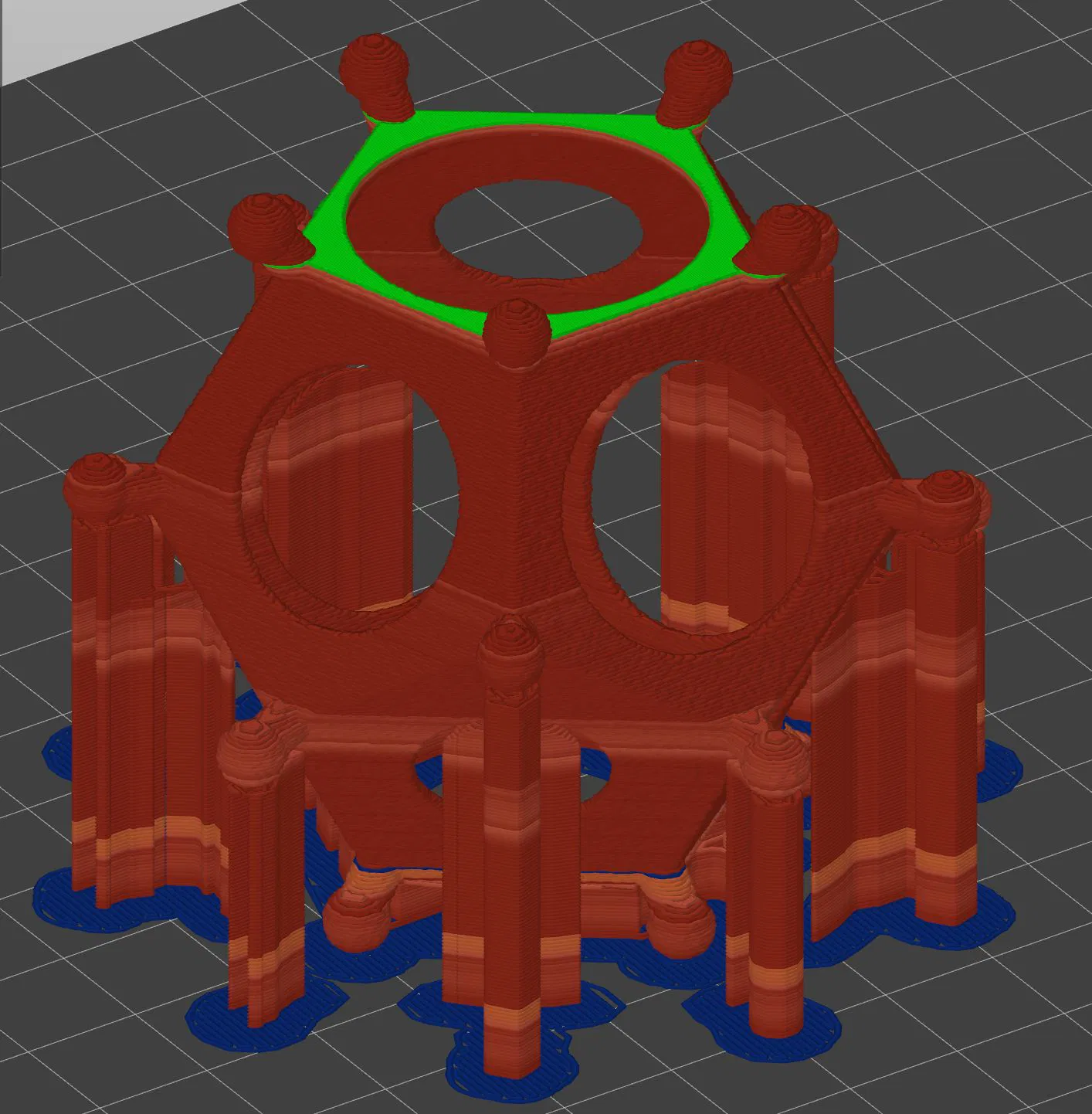 In bằng PLA với supports ôm sát và auto-cooling. Dùng ironing, fine fuzzy skin để che lớp layer.