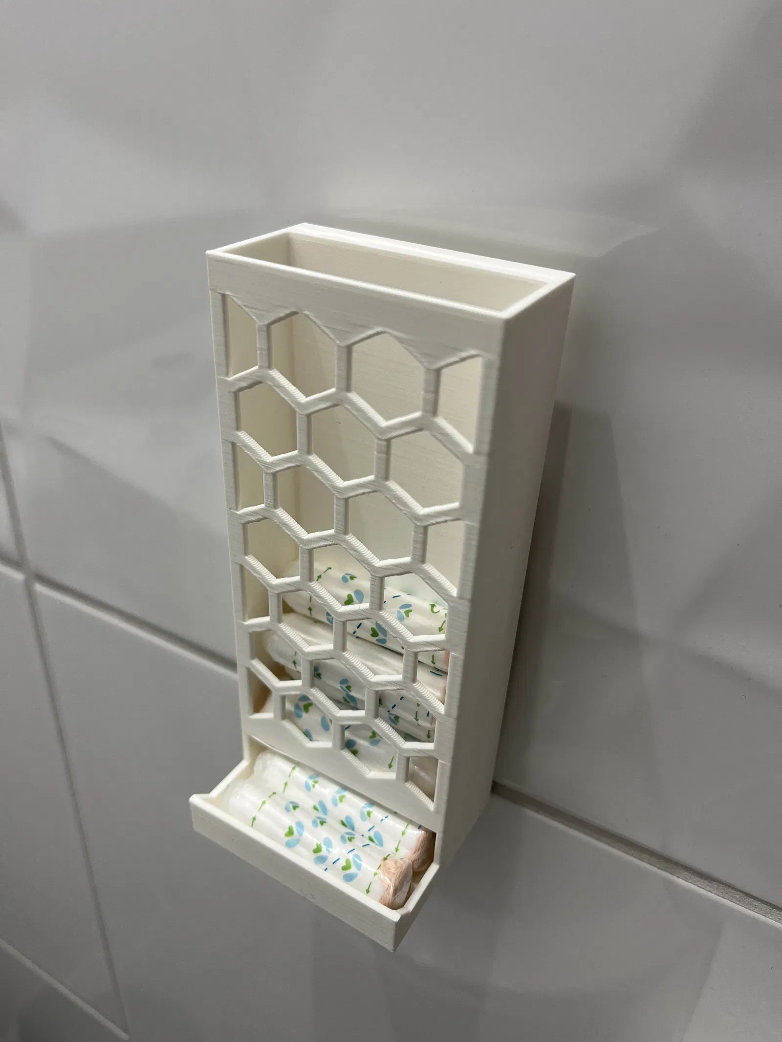 Giá treo tường để đựng và lấy tampon tiện lợi, có chỗ gắn giác hút. Gồm 2 phiên bản: bản đơn giản và bản có vị trí cho tấm trang trí; mặt sau có lỗ để gắn giác hút hoặc bắt vít đầu dẹt.