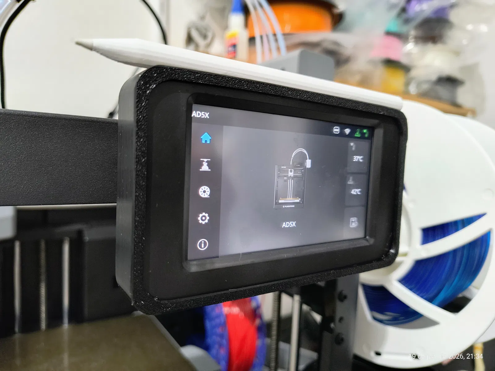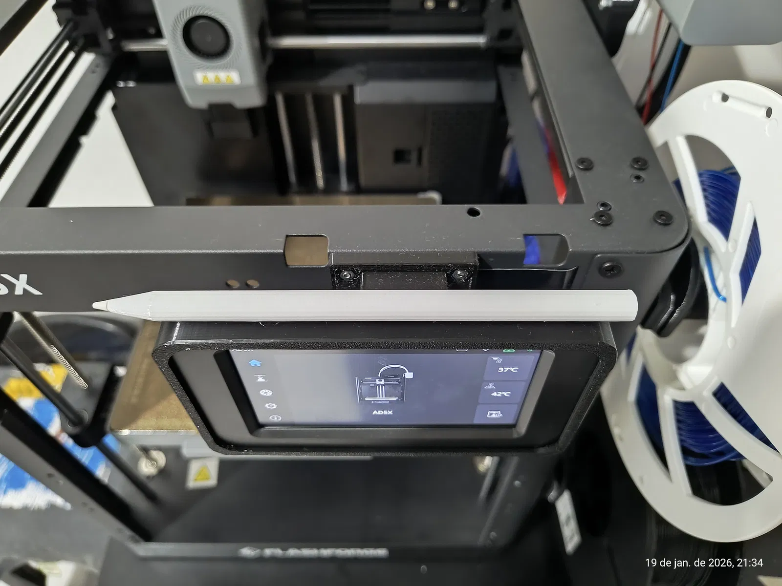 Moldura và bút cho LCD AD5X có gắn nam châm. Bút cần pause in khoảng layer 14/15 để dán nam châm 6x1mm; moldura có sẵn hốc lộ ra dùng cùng kích thước. Có thể thêm đầu TPU nếu cần.