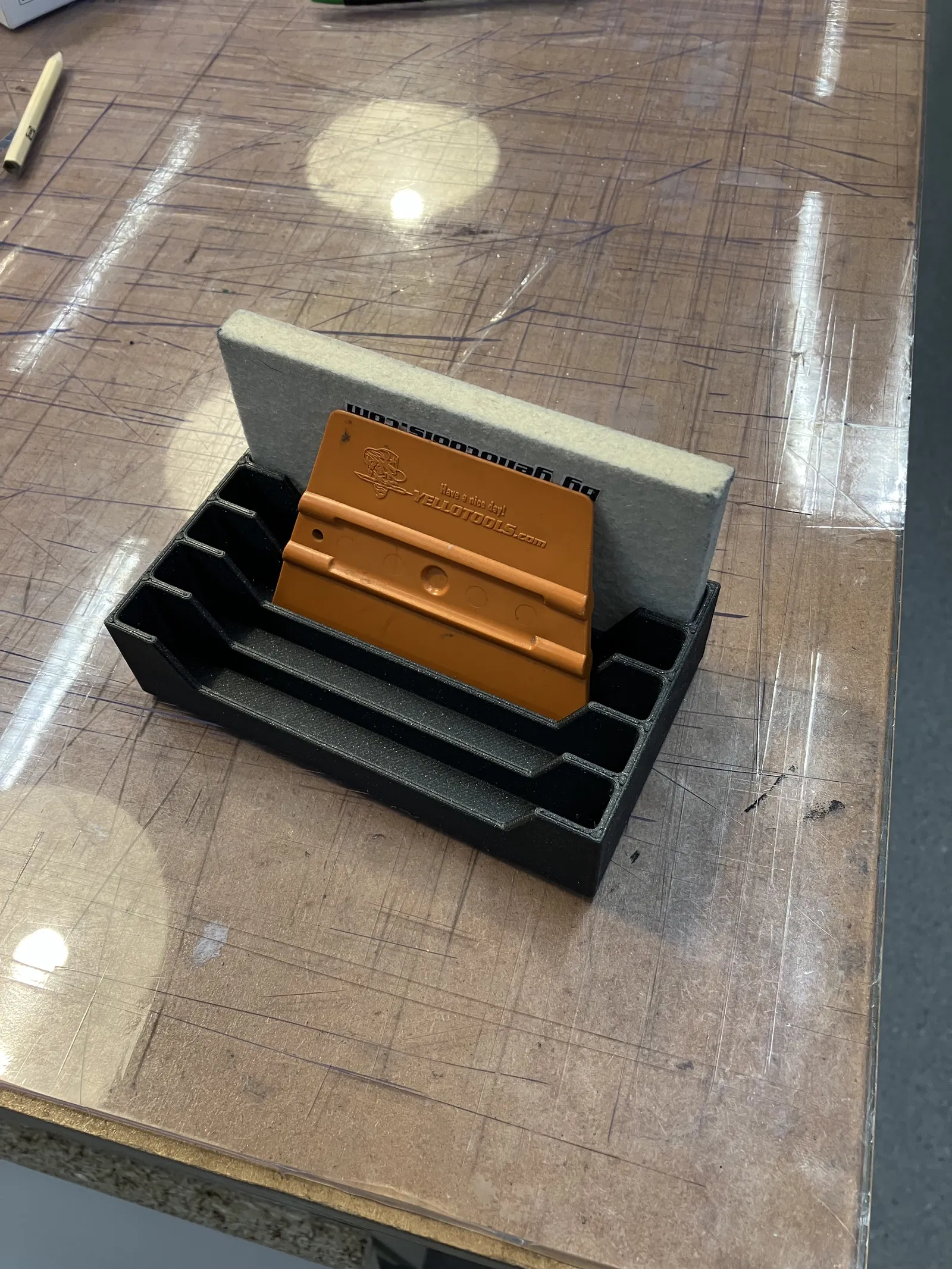 Giá đỡ dành cho các cây squeegee nỉ dùng trong đồ họa. Hỗ trợ kích thước tối đa ngang 125 mm, sâu 10 mm và có thể để cùng lúc tối đa 5 cây.