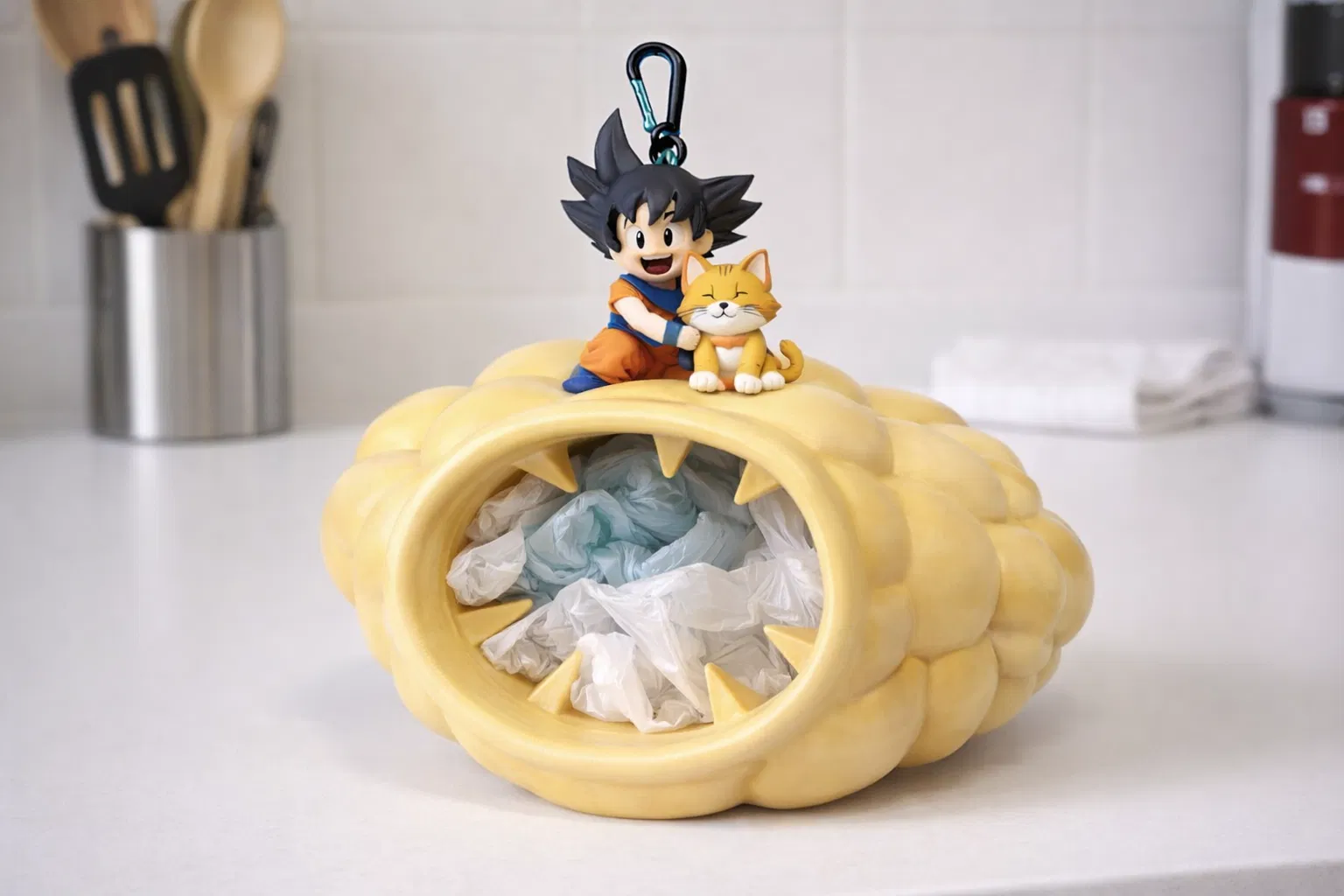 Giúp bạn sắp xếp túi nhựa gọn gàng, tiện dụng mà vẫn vui mắt với Suporte para Sacolas PET – Goku Nuvem.