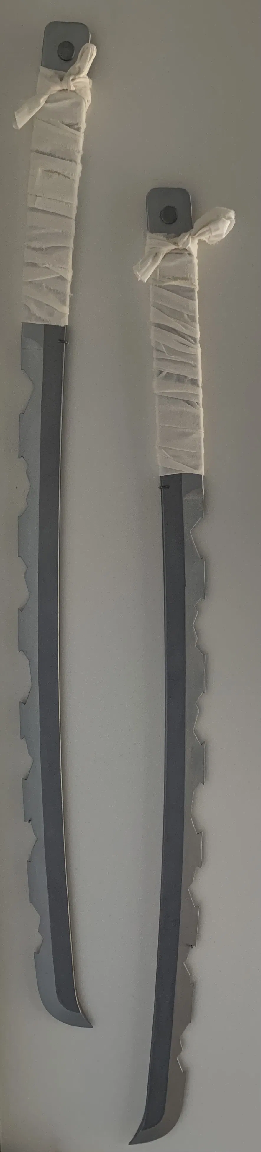 Katana của Inosuke trong manga/anime Demon Slayer (Kimetsu no Yaiba). Mẫu in 3D gồm nhiều phần có thể dán lại bằng super glue; không dùng thanh kim loại vẫn giữ được, nhưng cầm chơi dễ phát tiếng răng rắc.