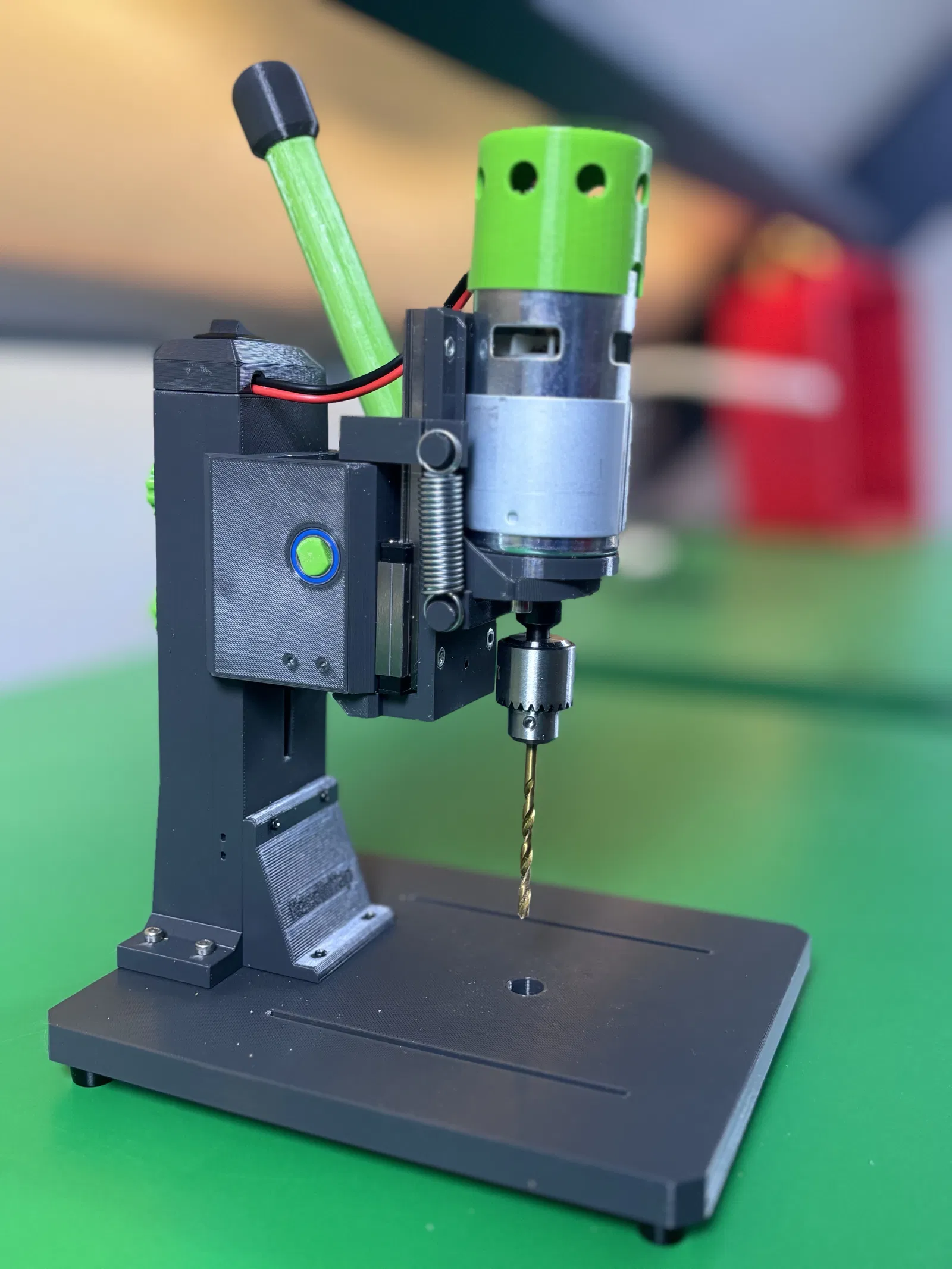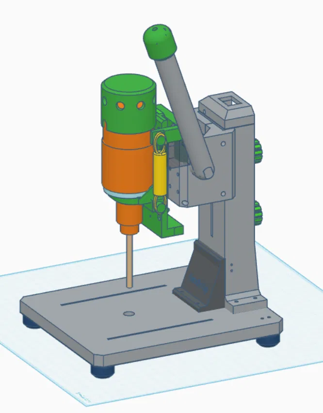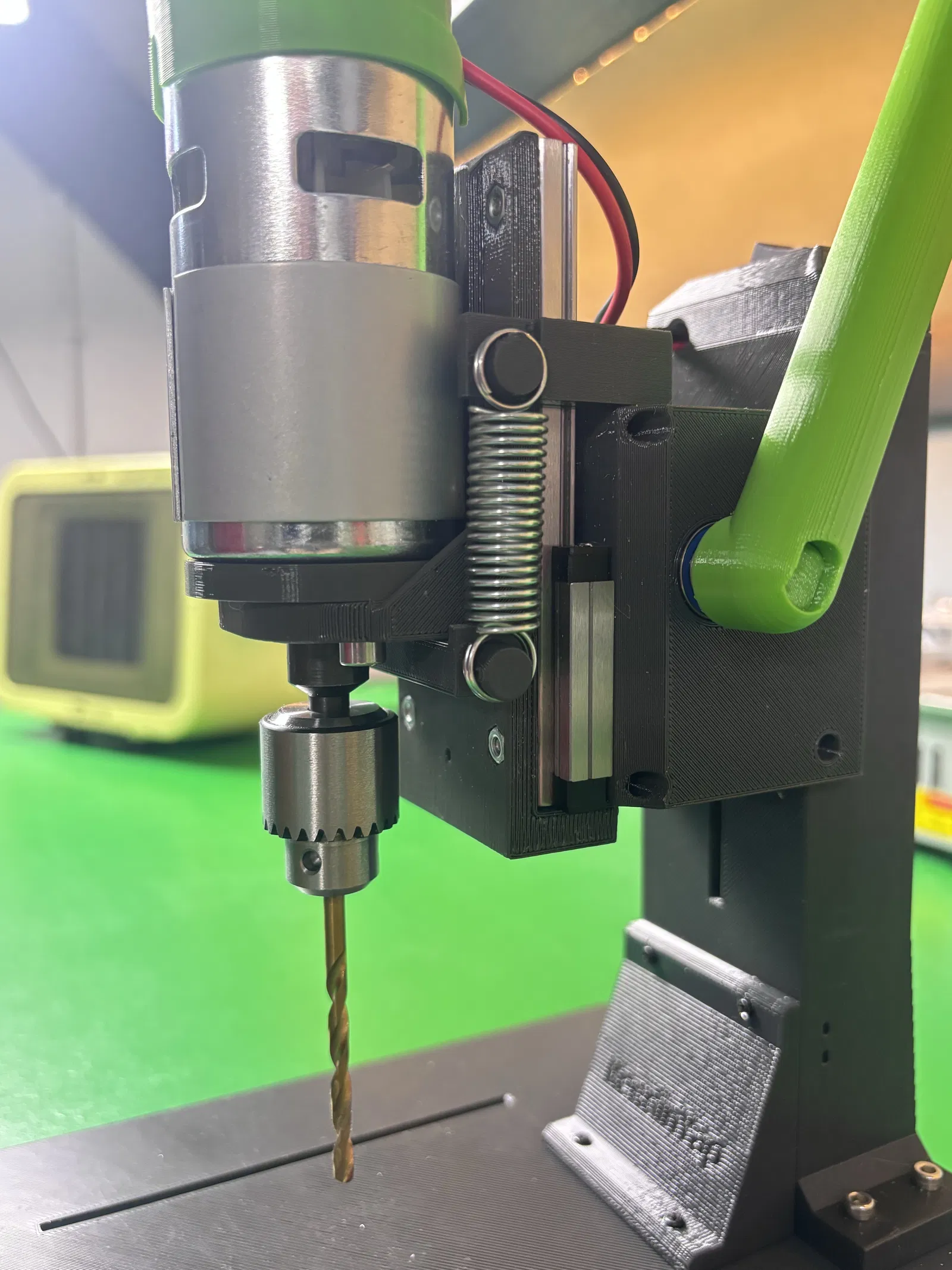 Bản Benchdril được chỉnh để dùng motor 795/775 lớn hơn, nâng vị trí motor và thay lò xo phù hợp. Có thêm bộ depth stop chỉnh độ sâu và nắp motor tùy chọn; các file khác ngoài motor mount vẫn giữ nguyên.