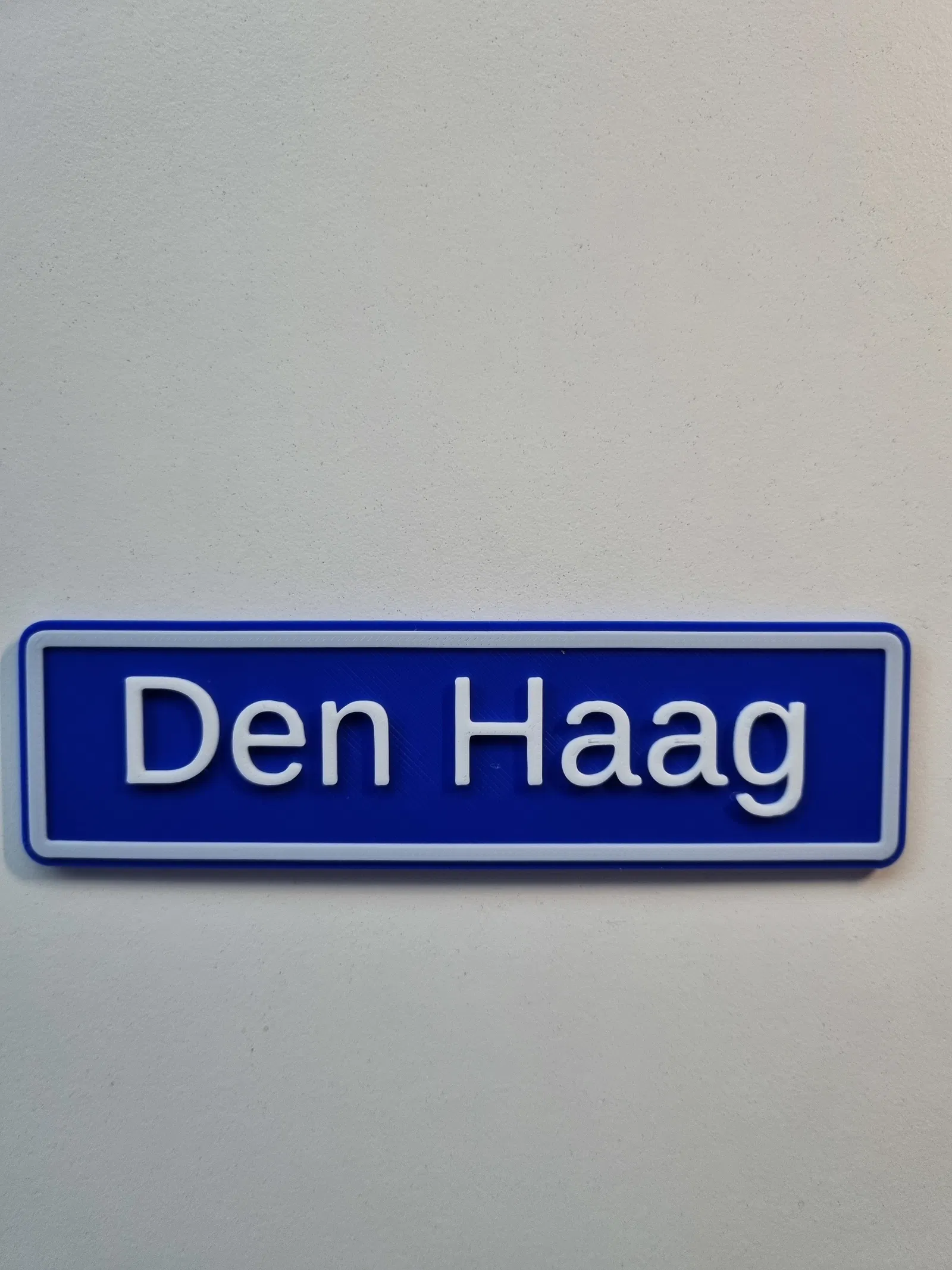 Mẫu bảng tên thành phố Den Haag để in 3D, chữ nổi và viền nổi nhìn sạch sẽ. Nếu muốn đổi tên thành phố, thay kích thước hoặc thêm lỗ bắt vít, bạn có thể dùng CitySign Generator để tuỳ biến nhanh.