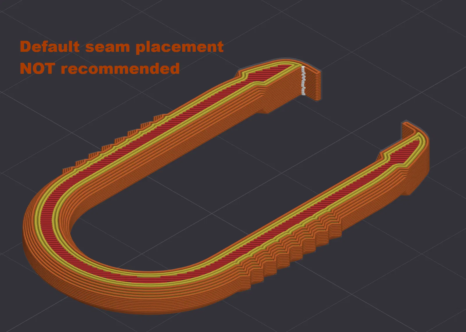 In với nozzle 0.4mm và chỉnh seam thủ công để không nằm ở chỗ hai ngàm. (xem hình ví dụ để biết nên đặt seam ở đâu là ổn nhất)