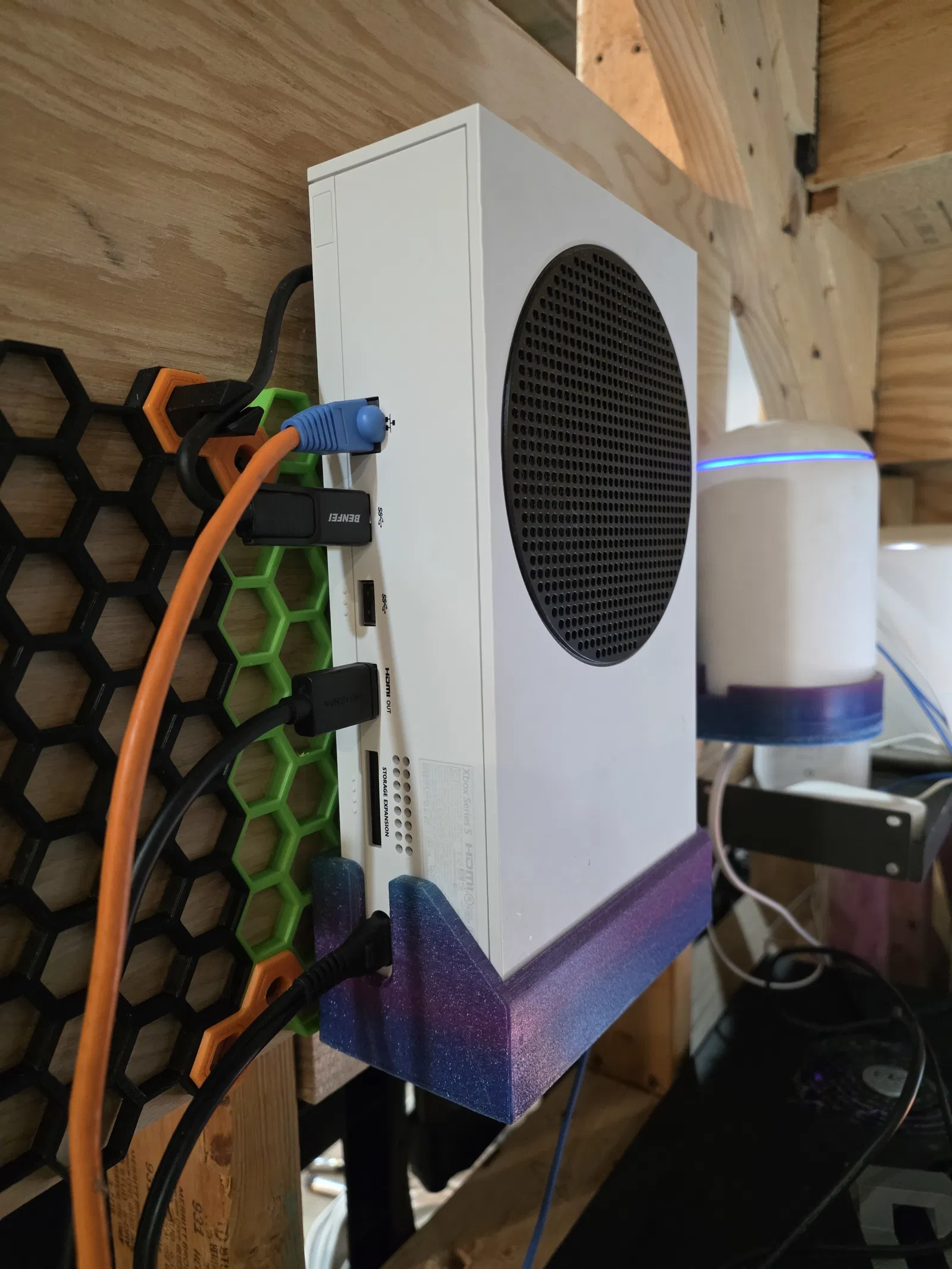 Xbox Series S HSW Mount - Bản remix từ bản remix của Losem. Mình đã bỏ phần đặc phía trên lỗ dây nguồn ở mặt sau và lỗ USB ở mặt trước để cắm/kết nối dễ hơn. Mình cũng bỏ bớt một số lục giác honeycomb ở mặt sau để dễ đưa vào HSW hơn.