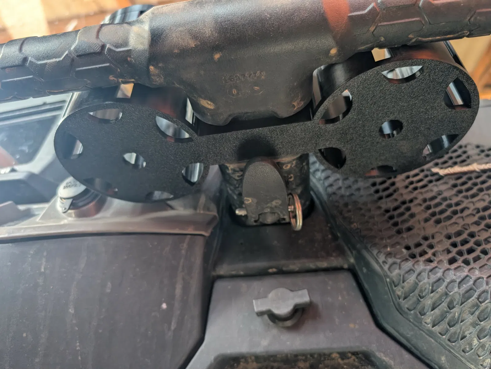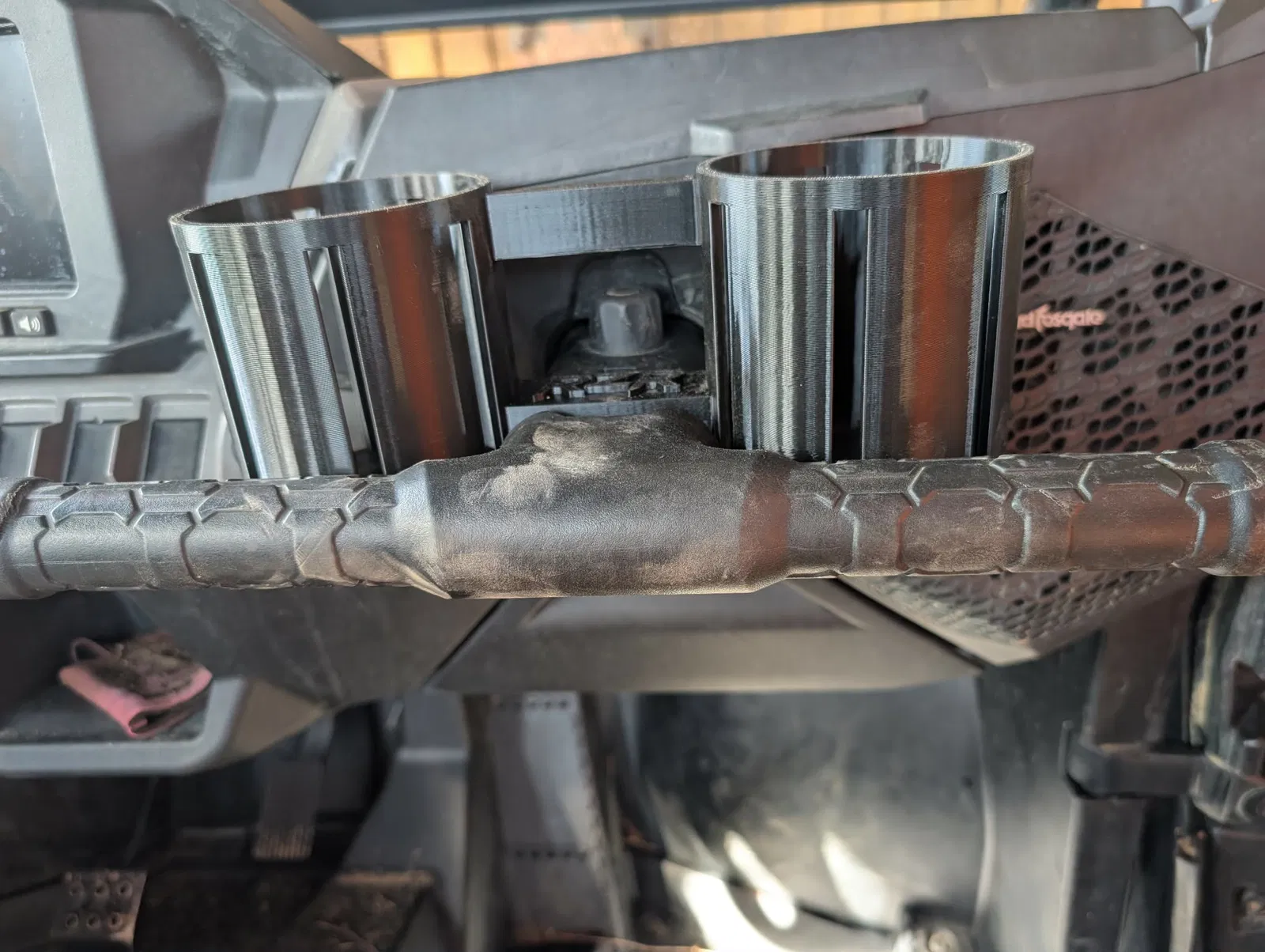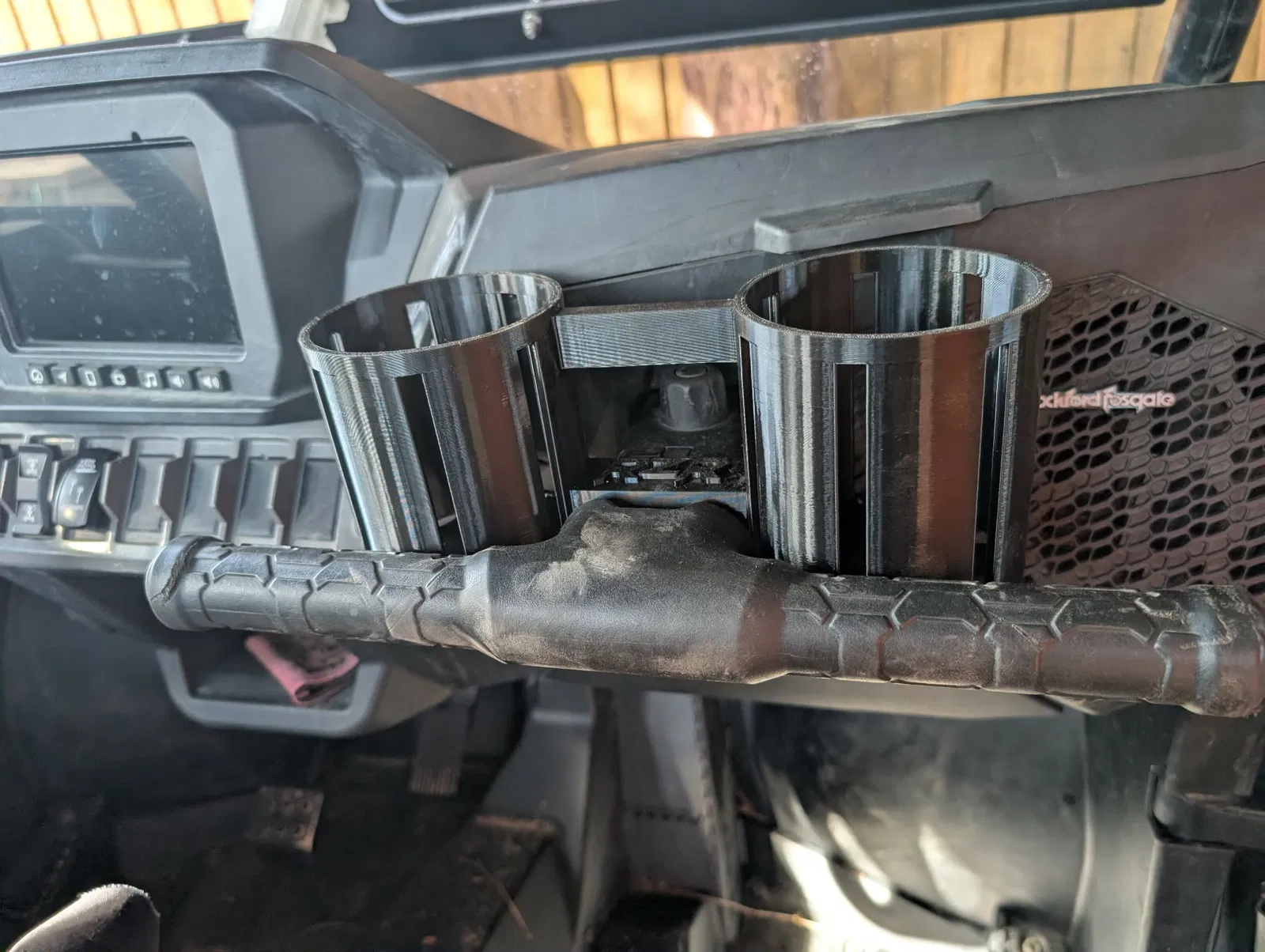 Bản cup holders gắn cao cho 2024 RZR XP 1000, được dời lên nằm hoàn toàn phía trên grab handle để chừa thêm chỗ cho chân/đầu gối. Thiết kế không thòng xuống dưới và không cấn nắp hộp đồ.