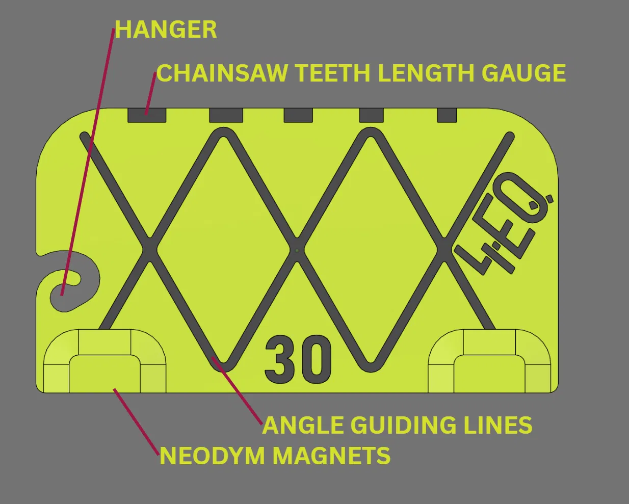 Sharpening grid tương phản cao cho xích cưa, có vạch guide để kiểm tra răng xích đều nhau giúp cắt thẳng, kèm móc để treo hoặc gắn bằng nam châm. Khuyến nghị in PETG, 6 perimeters, infill cao.