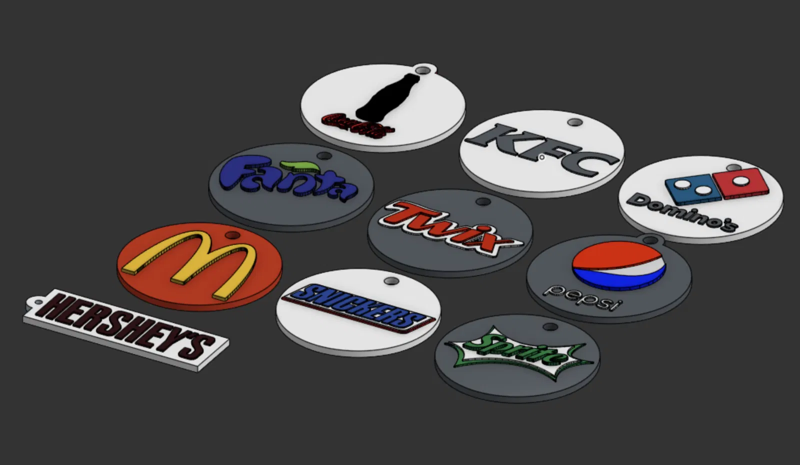 Bộ mô hình móc khóa lấy cảm hứng từ các thương hiệu đồ ăn và thức uống phổ biến. Phù hợp để in 3D làm phụ kiện trang trí, treo chìa khóa hoặc làm quà tặng cho bạn bè.