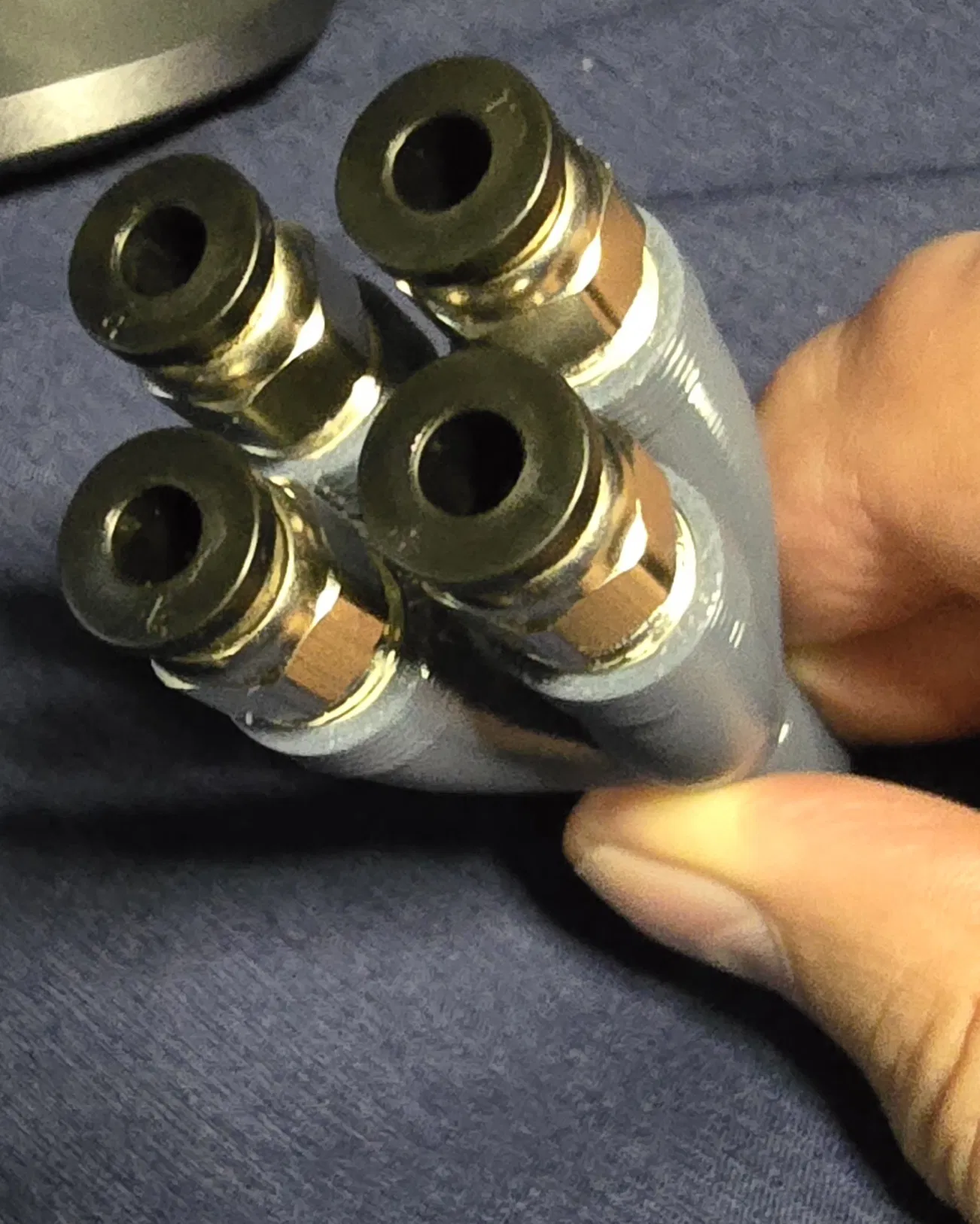 Bộ converger/splitter PTFE 4-1 dùng ren M10 cho đầu nối PC4. Gợi ý in PETG dựng đứng, có supports và brim. Có file STEP. Bản cập nhật tăng boss và thu lỗ thoát 3mm giúp interface PC4 mượt hơn.