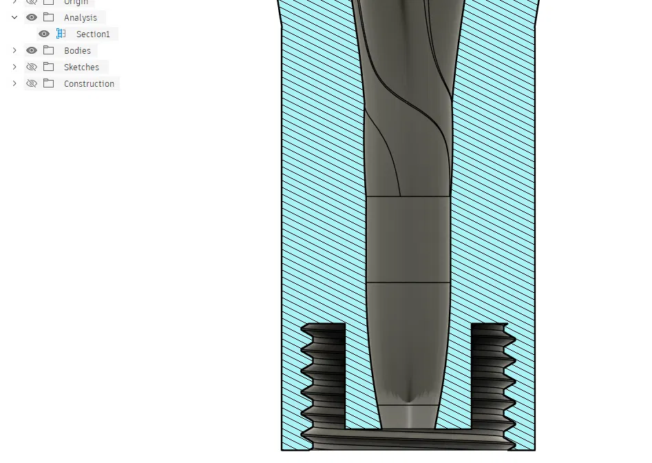 Mình tăng chiều cao của phần boss bên trong ở phía đầu ra và tạo rãnh (fluted) cho lỗ thoát xuống còn 3mm để phần tiếp xúc PC4 mượt hơn — chạy ổn hơn rất nhiều.
